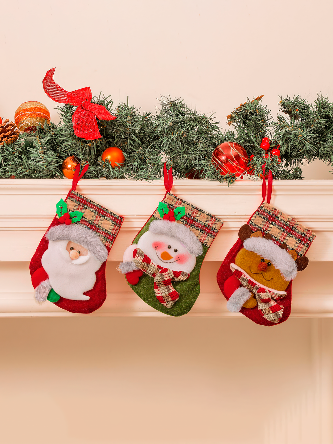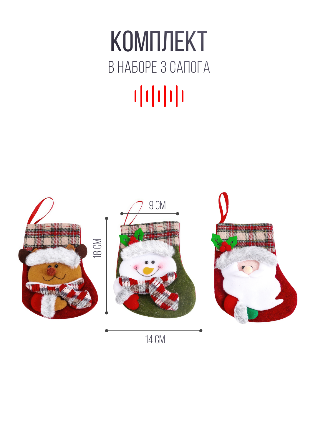 Новогоднее праздничное украшение "Рождественский чулок, новогодний носок для конфет с Дед Морозом", набор из 3 информация: