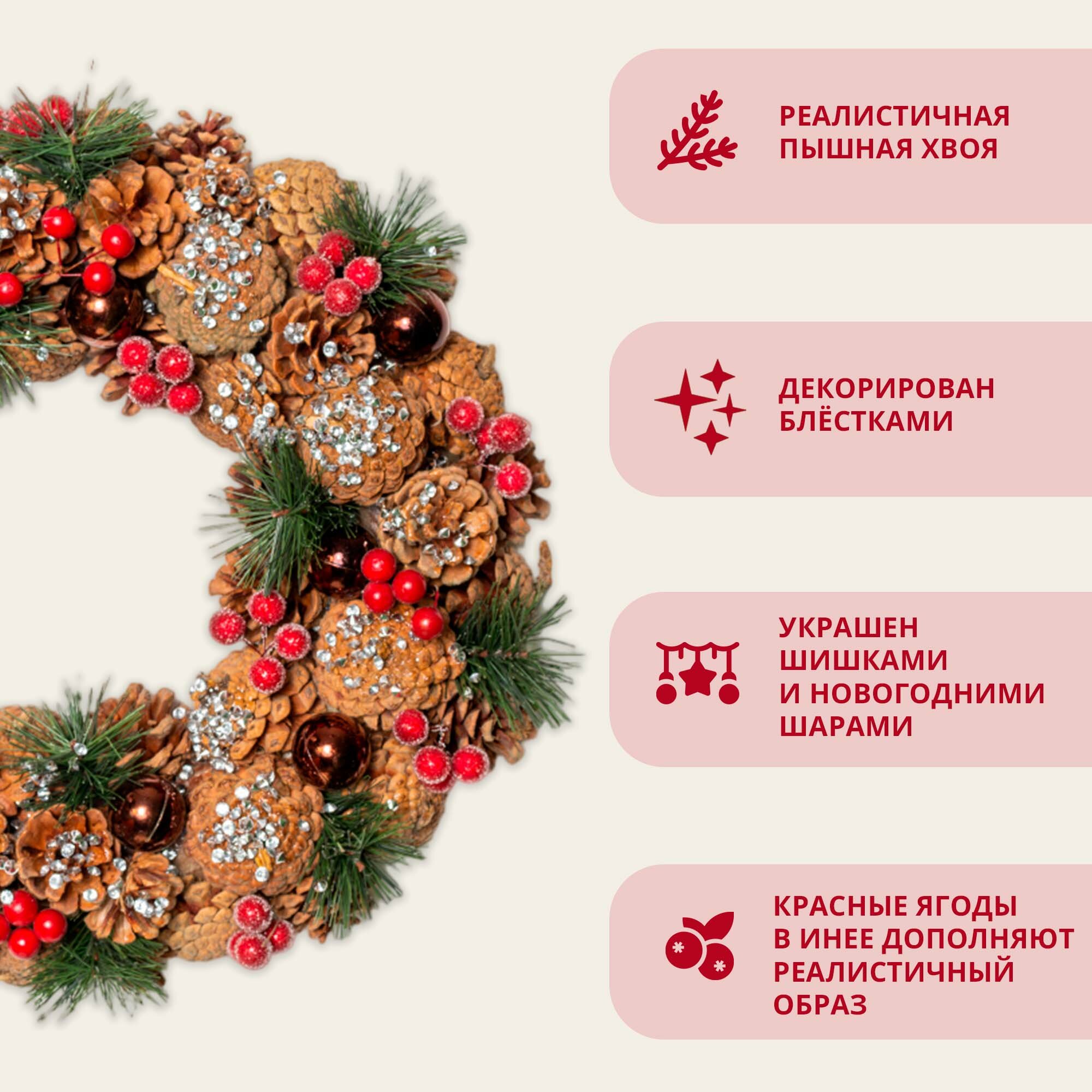 Рождественский венок новогодний на дверь и декор на стол с шишками и шариками, с еловыми веточками информация: