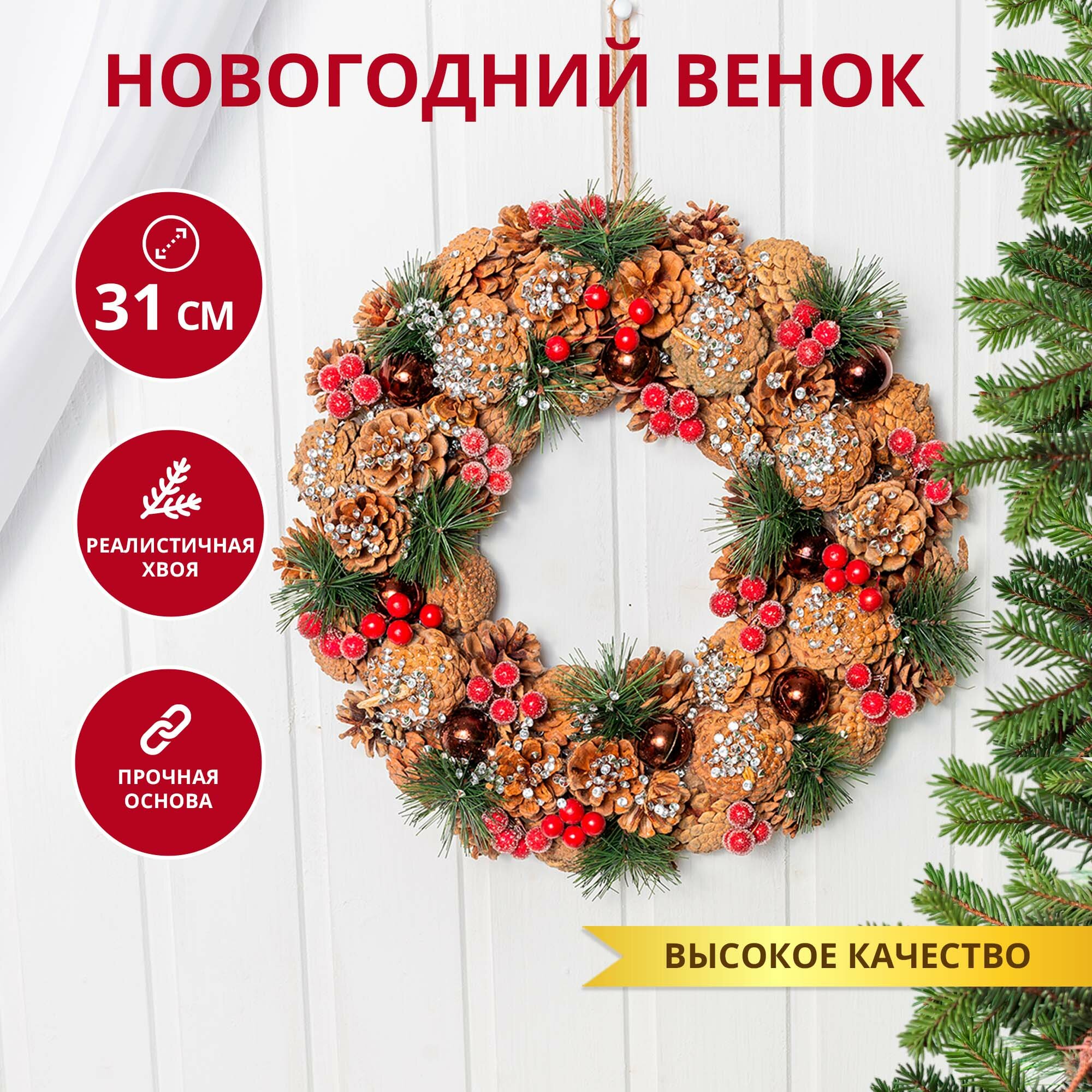 Отзывы на Рождественский венок новогодний на дверь и декор на стол с шишками и шариками, с еловыми веточками