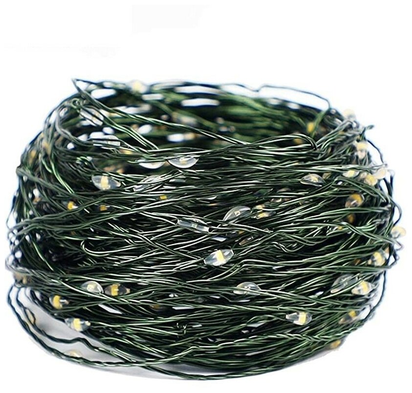 10 цен на Гирлянда роса 100м теплый свет, зеленый провод, от сети 8 режимов, с пультом управления