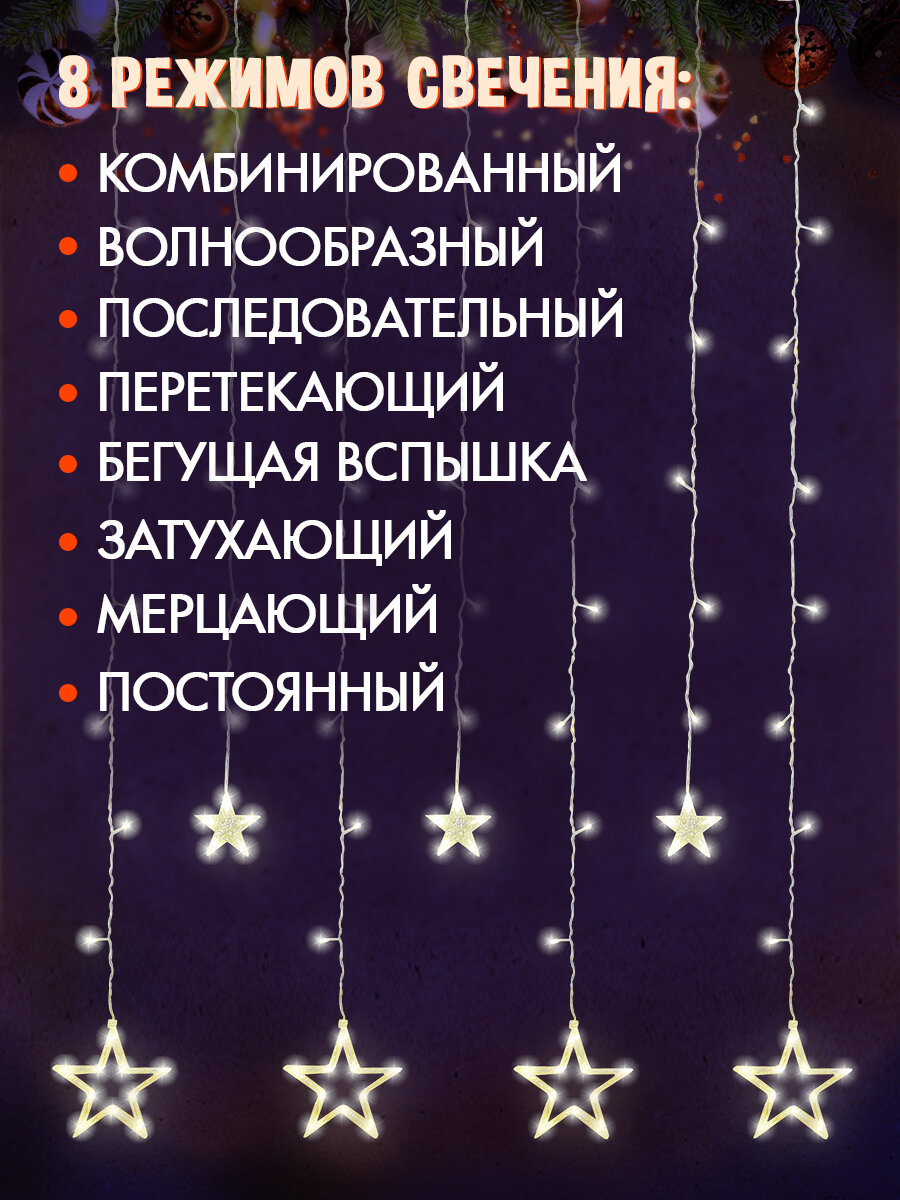 MiLED Гирлянда - Штора "Звездное небо" 2.5х1 м, 92 лампы, 8 режимов свечения, тёплый белый свет. Новогоднее украшение информация: