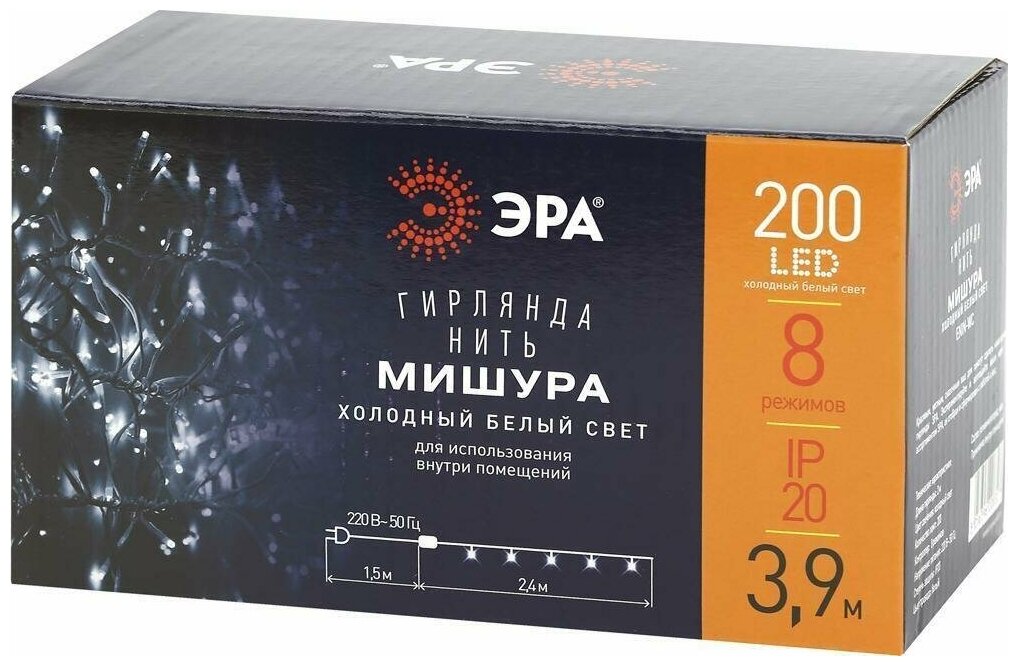 Гирлянда ЭРА Мишура 220V 200Led 3.9м (белый провод) IP20 холодный белый информация: