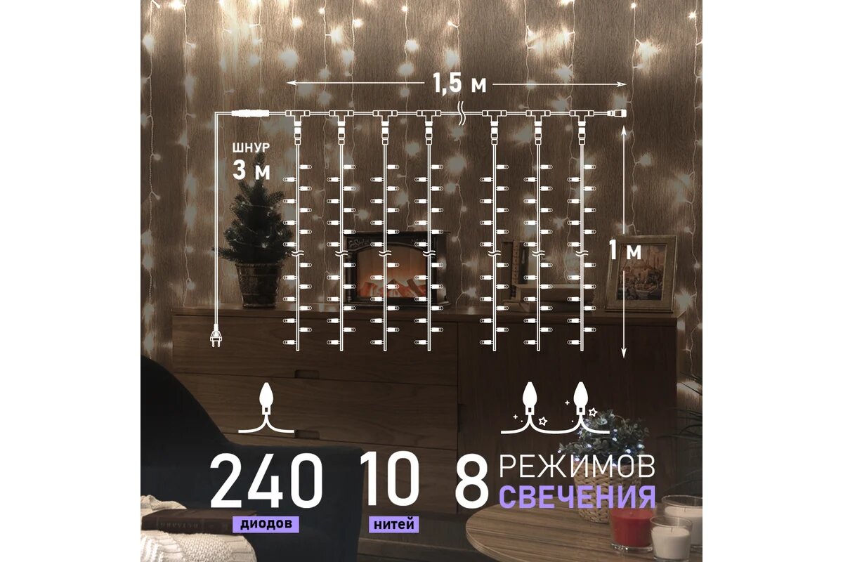 Отзывы на Светодиодная гирлянда NEON-NIGHT Дождь 8 режимов 2х3м 240 LED, прозрачный провод, белый 235-065