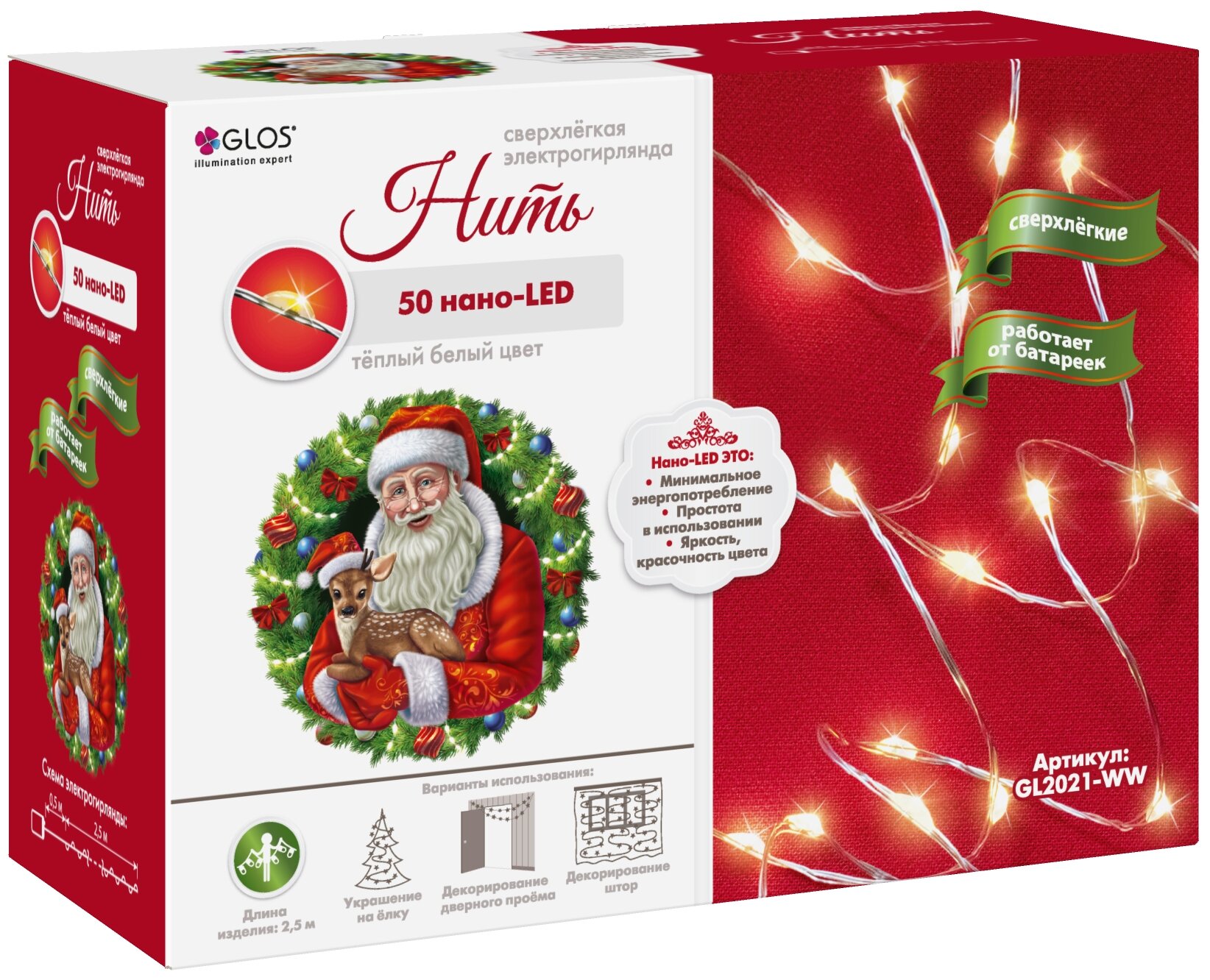 10 цен на Электрогирлянда GLOS нить GL2021-WW, 2.5 м, 50 ламп, теплый белый/прозрачный провод