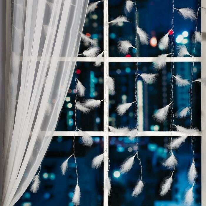 Гирлянда «Занавес» 3 × 1.4 м с насадками «Перья», IP20, прозрачная нить, 80 LED, свечение белое, 8 режимов, 220 В