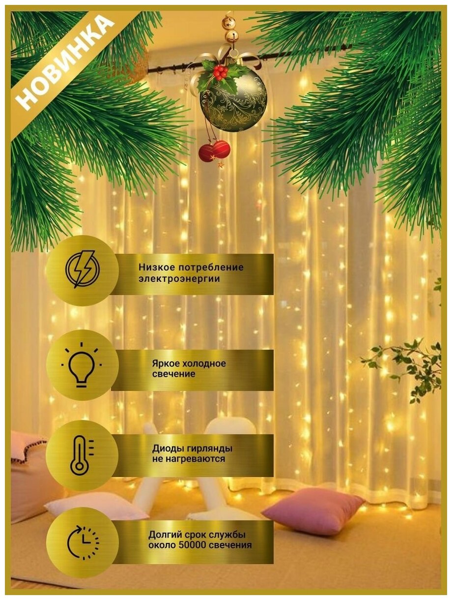Отзывы на Гирлянда "Занавес", 3x3 м, 190 LED, жёлтая, плавная смена света, питание от сети