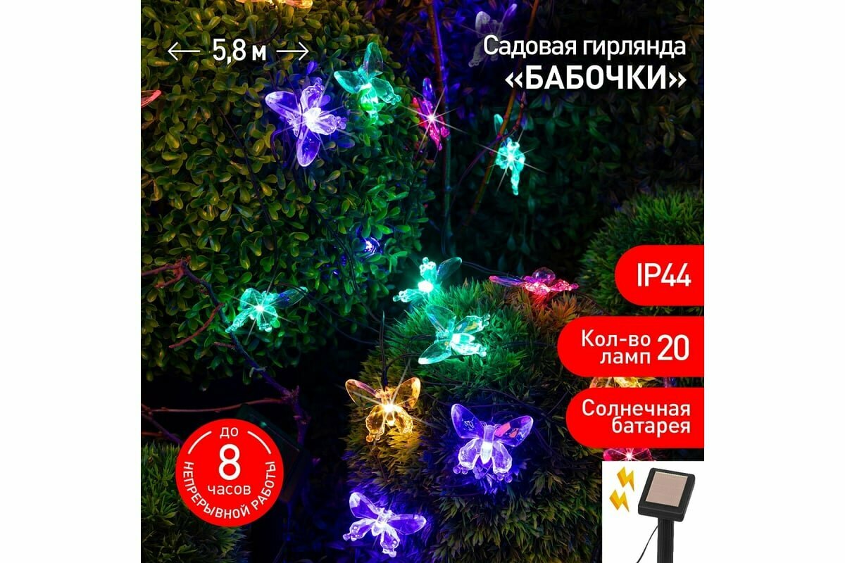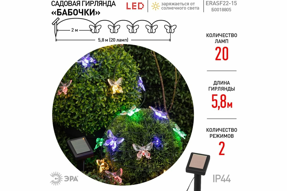 Садовая гирлянда ЭРА ERASF22-15 на солнечной батарее, Бабочки, 20 LED, 5.8 м Б0053364 информация: