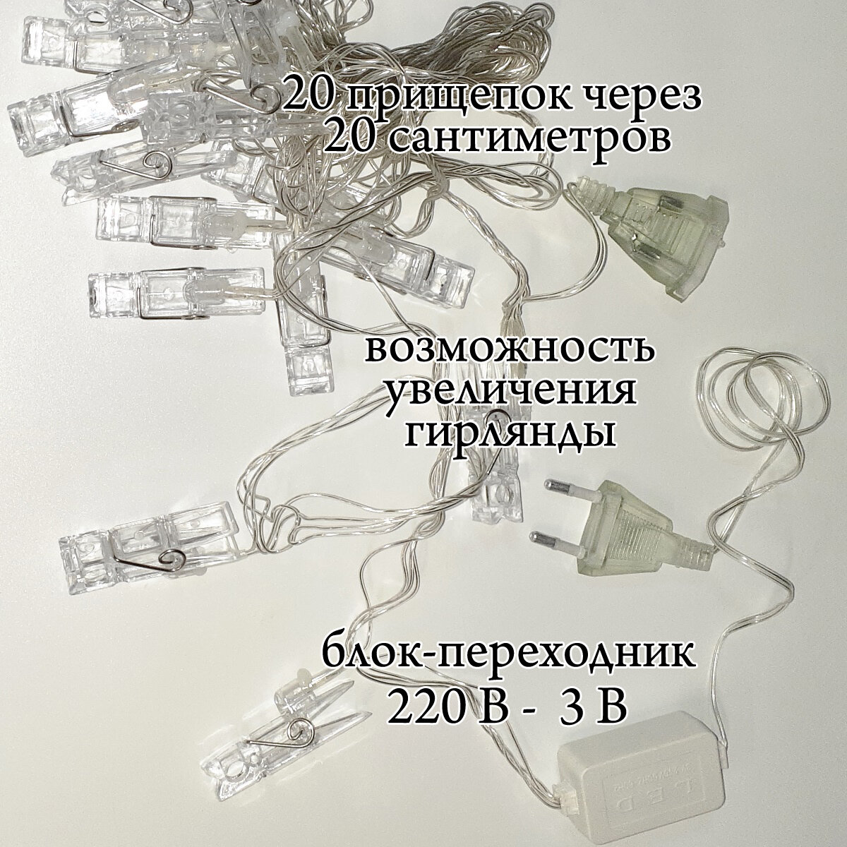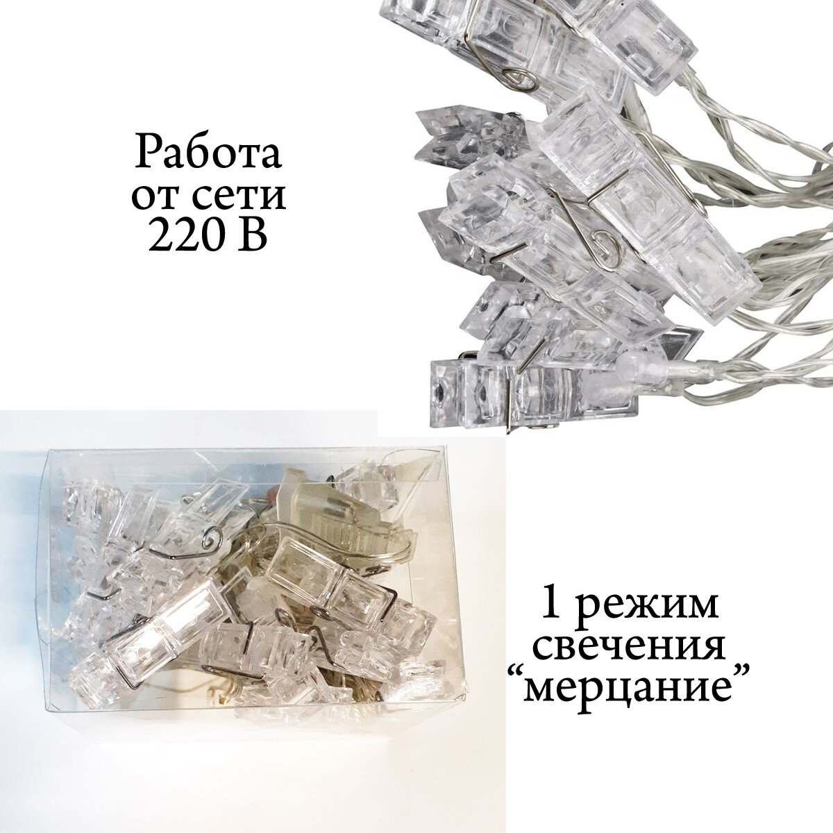 Гирлянда 20 Цветных прищепок для фотографий 220в информация: