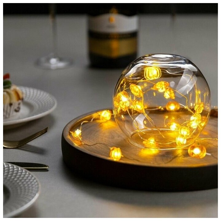 Отзывы на Гирлянда "Нить" 2 м роса с насадками "Тыква". IP20. серебристая нить. 20 LED. свечение теплое белое. 2 режима. ААх2