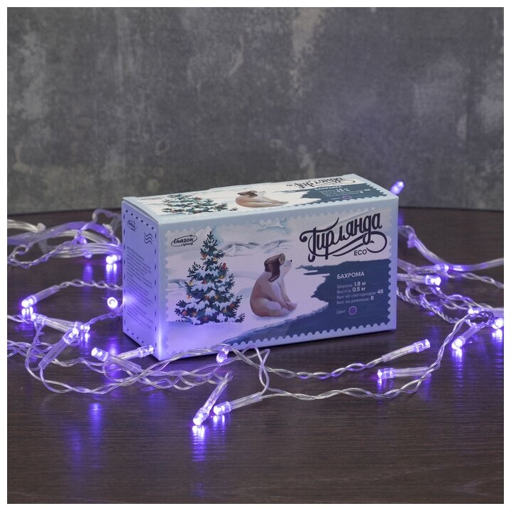Гирлянда "Бахрома" 1.8 х 0.5 м , IP20, прозрачная нить, 48 LED, свечение фиолетовое, 8 режимов, 220 В информация:
