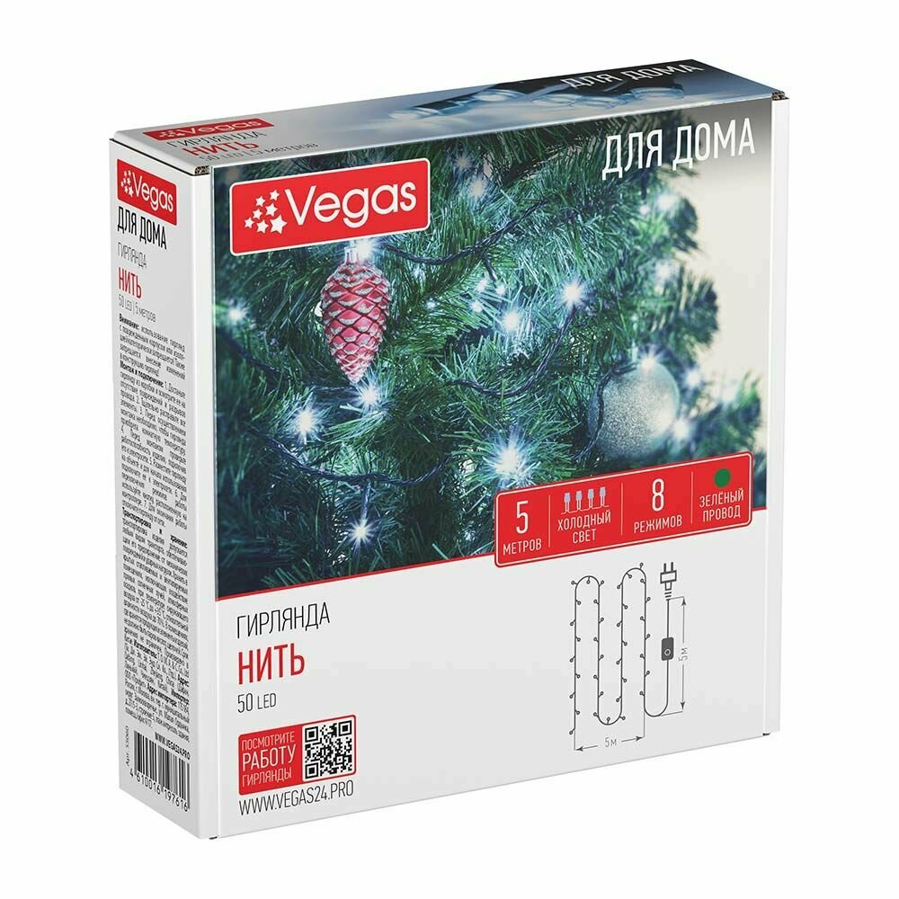 Гирлянда Vegas "Нить", 5м, 50 светодиодов, 8 режимов работы, IP20, зелёный провод 364 ₽