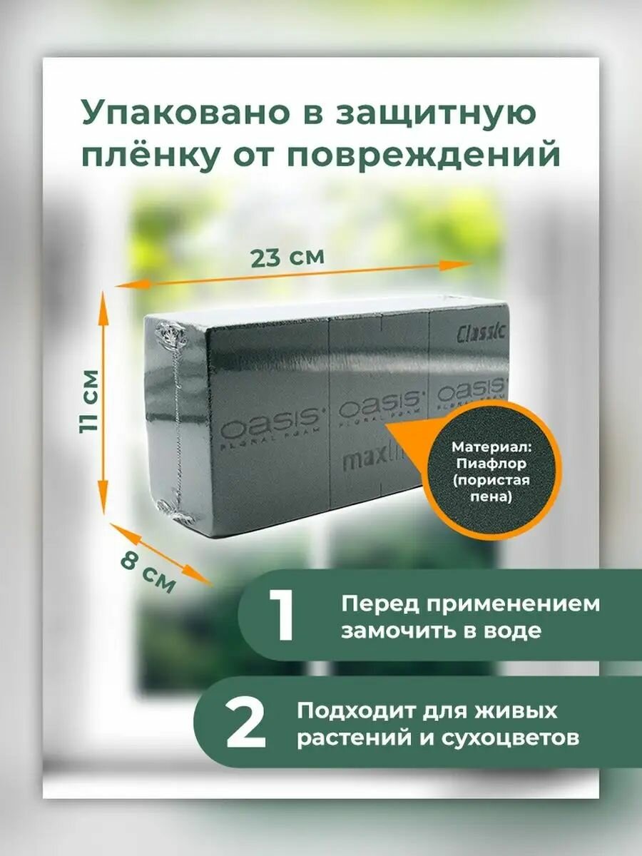 Губка флористическая Оазис Классик кирпич из пены для живых, сухих и искусственных цветов, зеленая, 23х11х8 см информация: