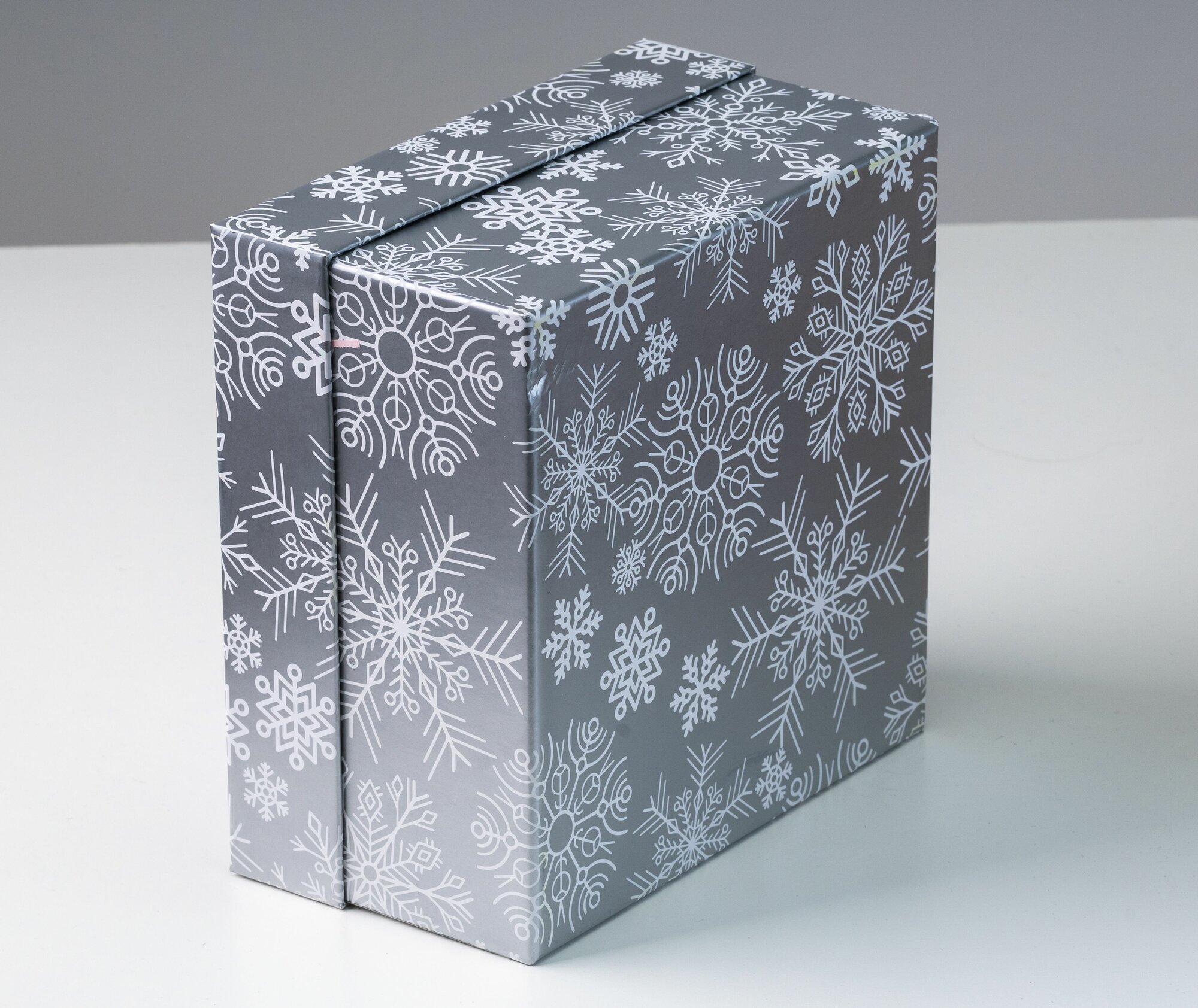 Квадратная коробка крышка-дно, 19 x 19 x 10,5 см. "Снежинки", серый металлик, белый информация: