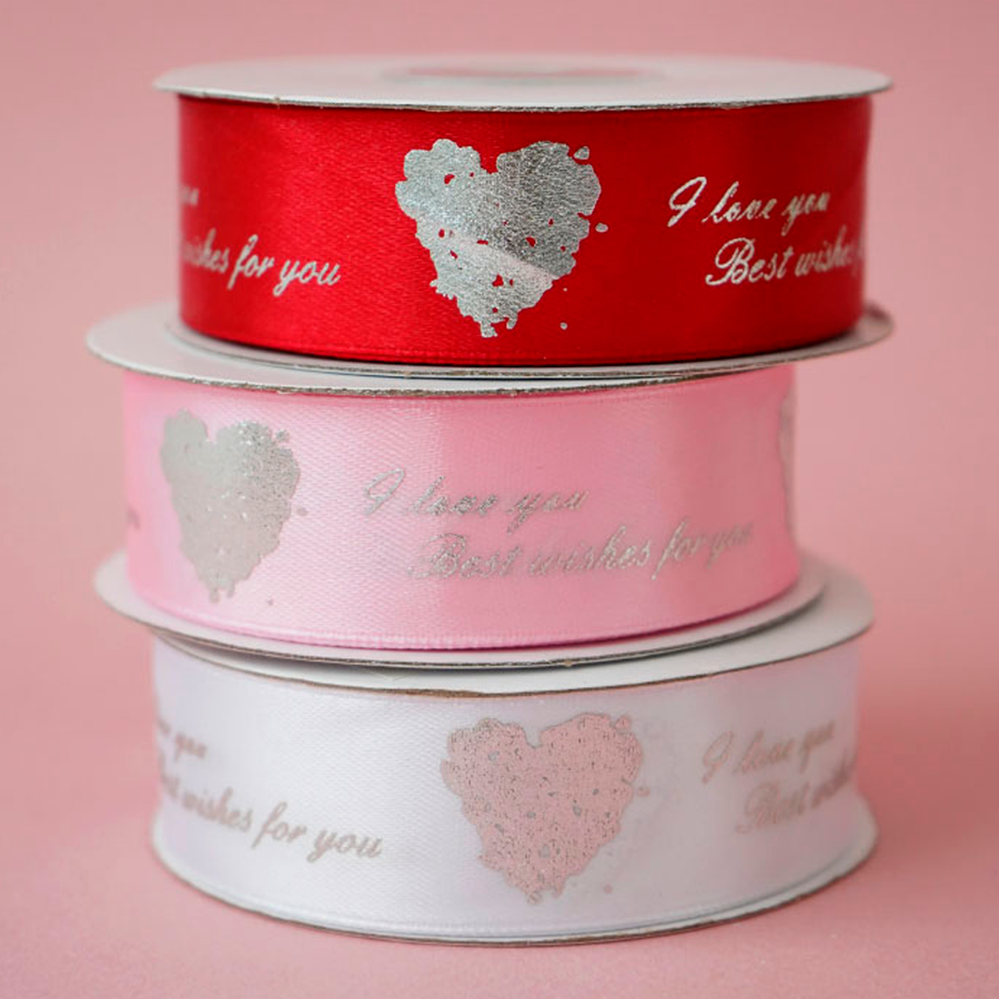 10 цен на Лента атласная упаковочная Серебряное сердце, розовая, 2,5 см х 22,85 м