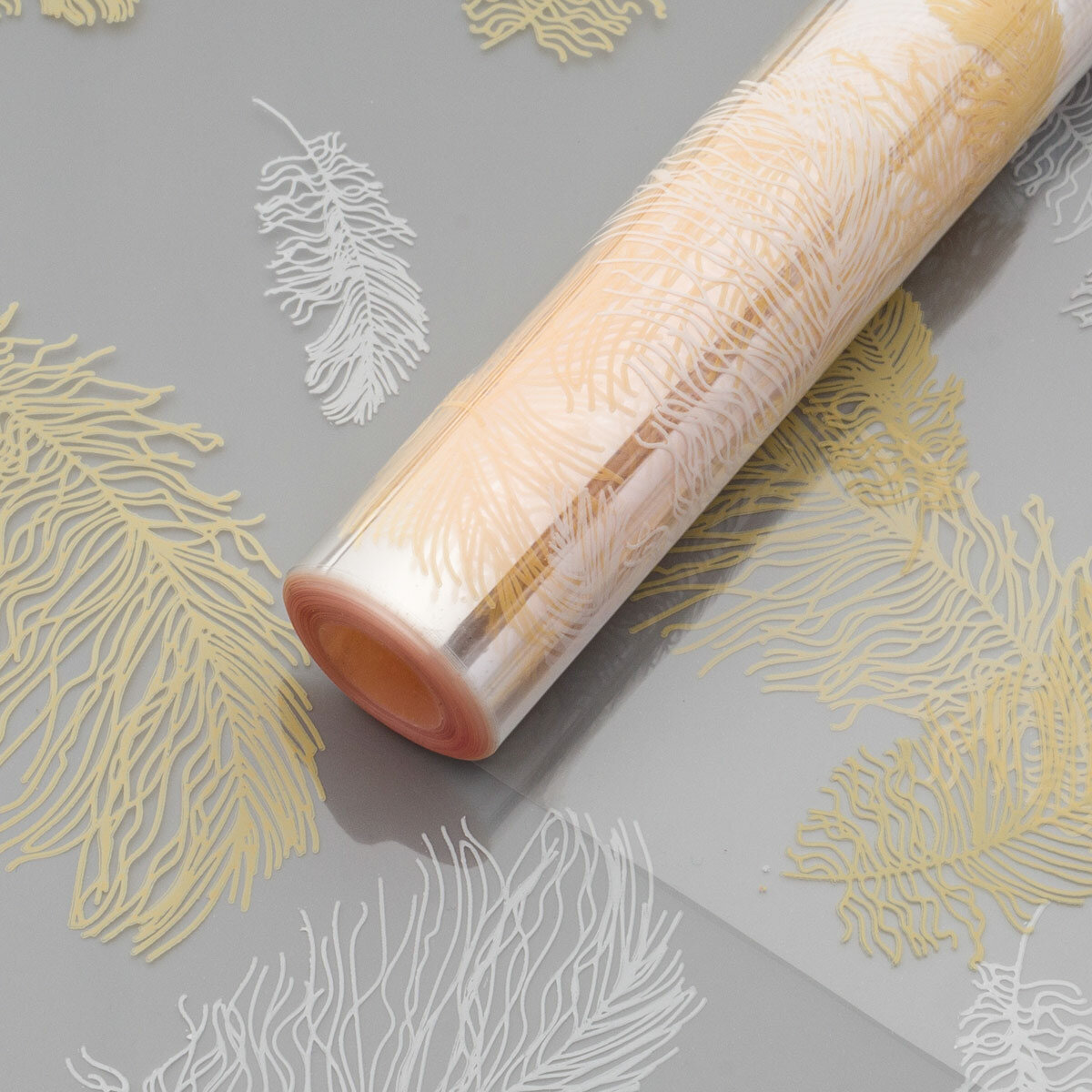 Пленка для цветов и подарков прозрачная с рисунком 'Перышки' Айрис, 40 мкм, 60см*9м, пудра, персиковый (105917) 265 ₽
