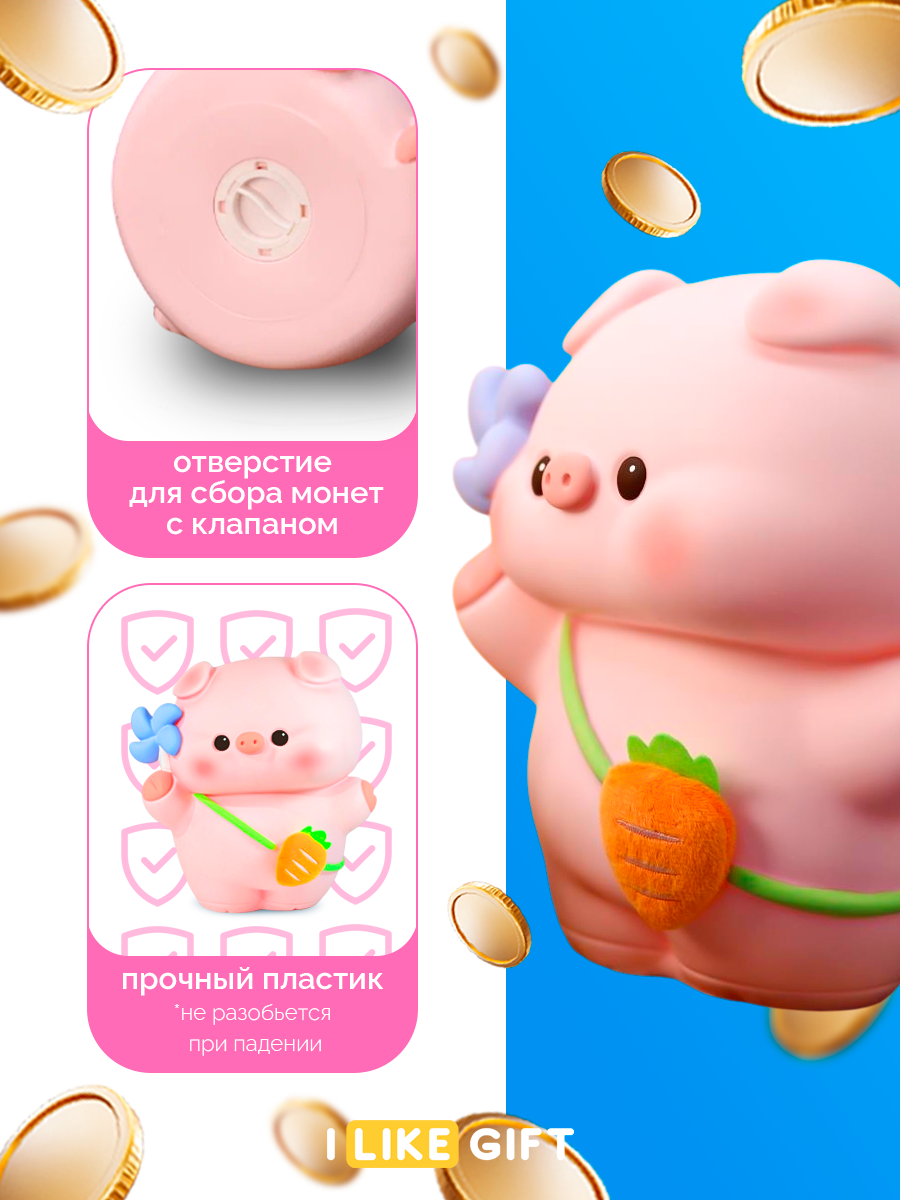 Копилка для денег "Свинья с морковкой", 22х20х14 см, пластик, для монет и купюр информация:
