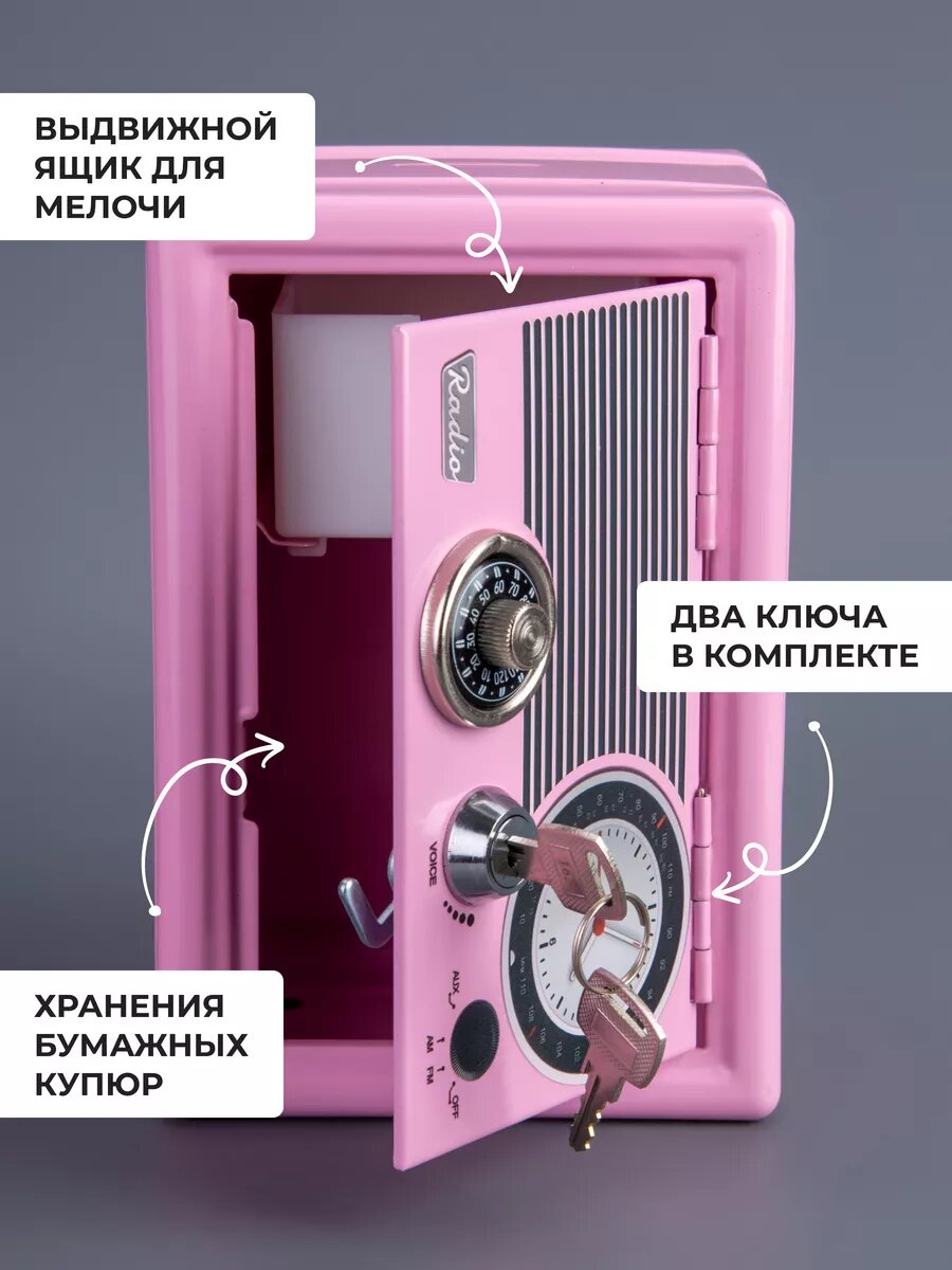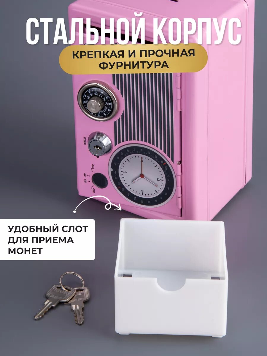 Копилка-сейф для денег в ретро стиле с замком и ключами, розовый информация: