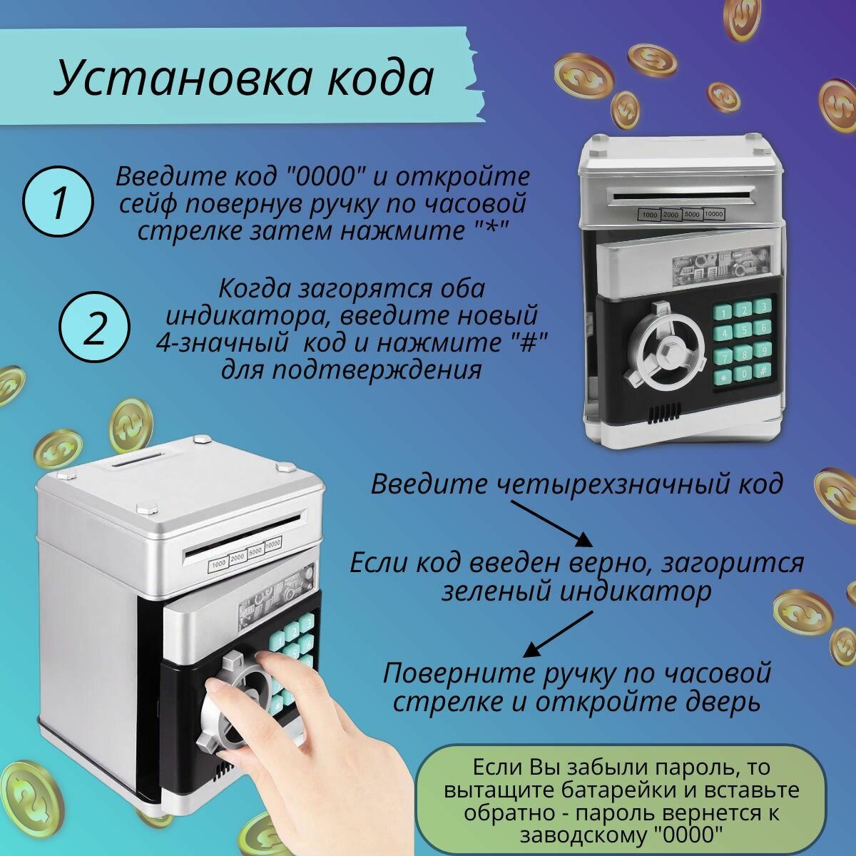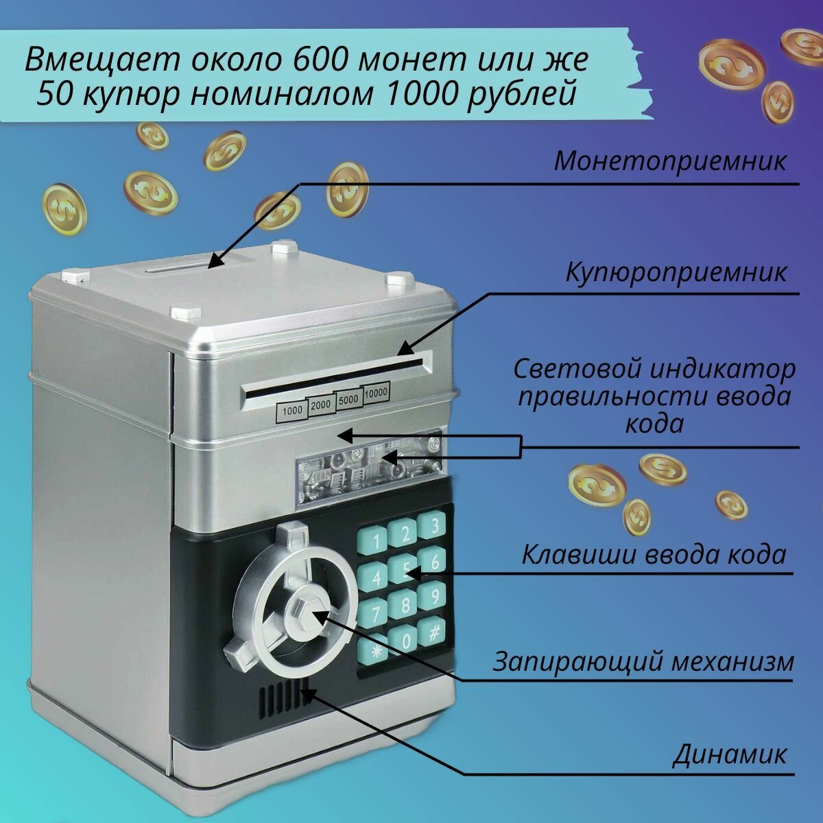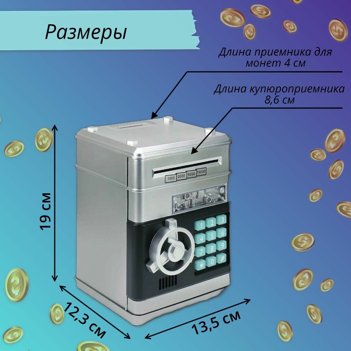 Детская электронная копилка сейф для денег с купюроприёмником и с кодовым замком, серебристая информация: