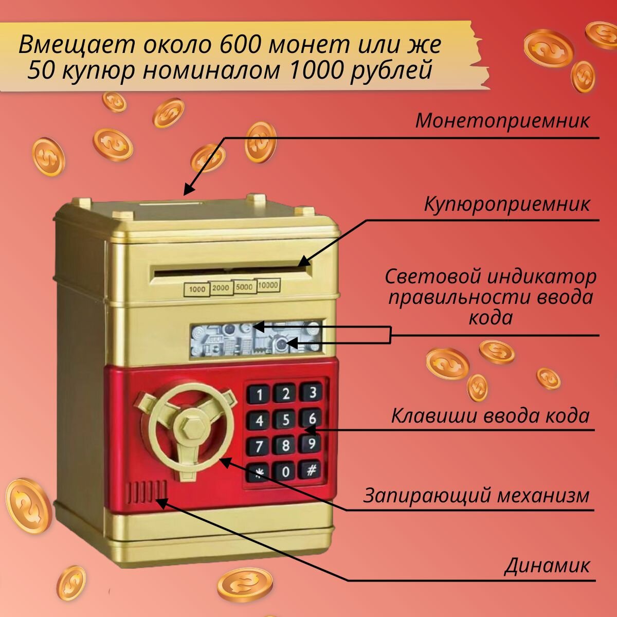 Детская электронная копилка сейф для денег с купюроприёмником и с кодовым замком, золотая информация: