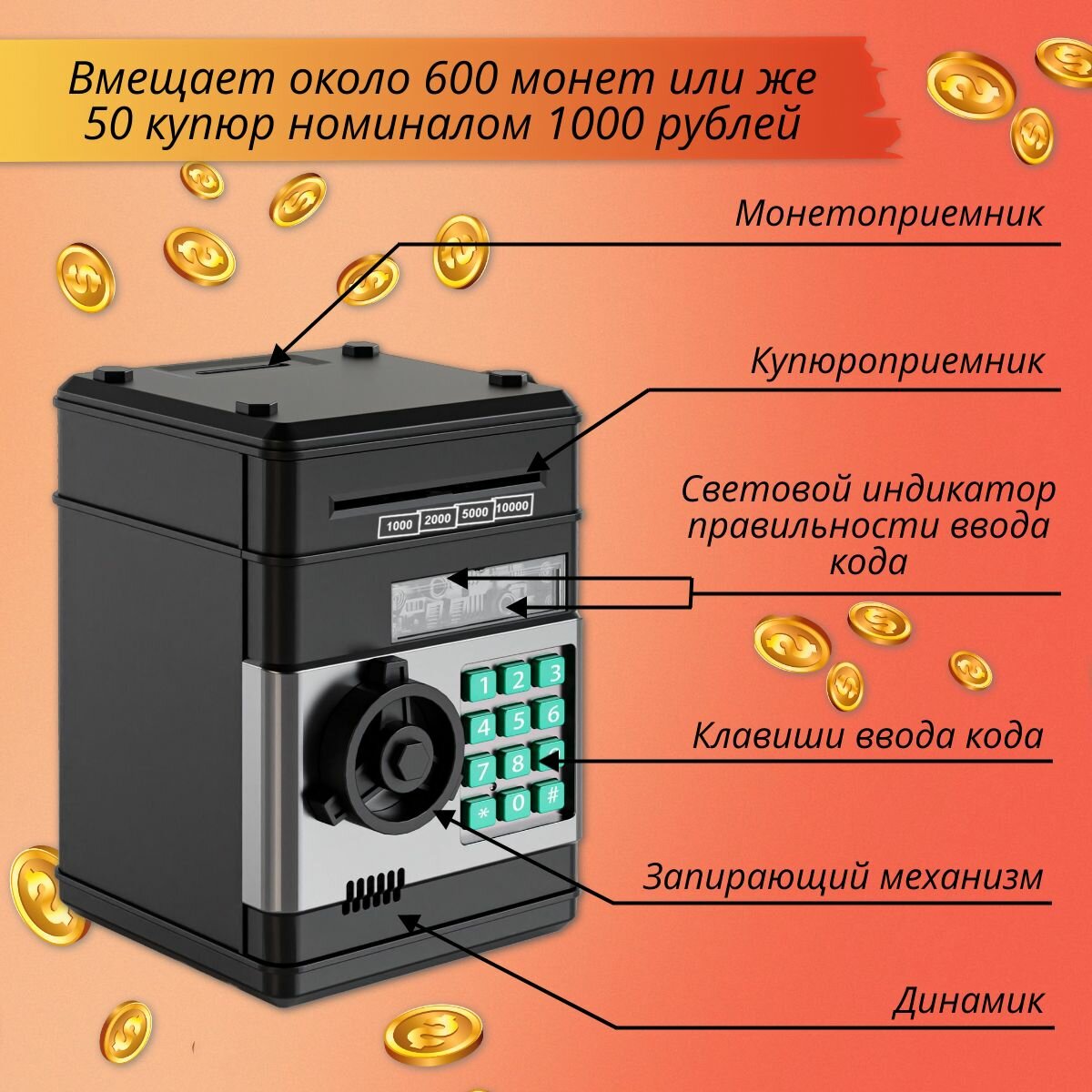 10 цен на Детская электронная копилка сейф для денег с купюроприёмником и с кодовым замком, черная