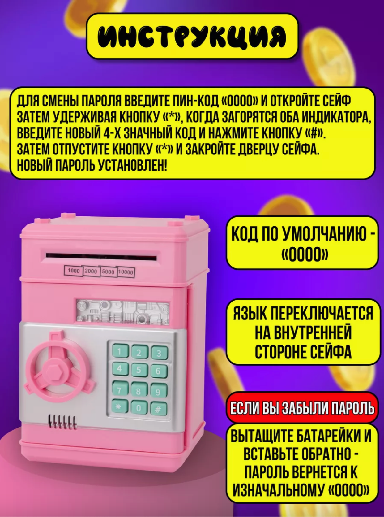 Отзывы на Копилка-сейф детская, для детей, звуковая, на батарейках, розовая