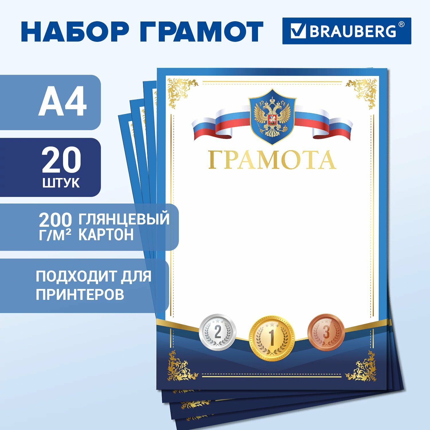 Грамота школьная похвальная, диплом для взрослых и детей А4, мелованный картон, набор 20 шт, Brauberg, 117544 212 ₽