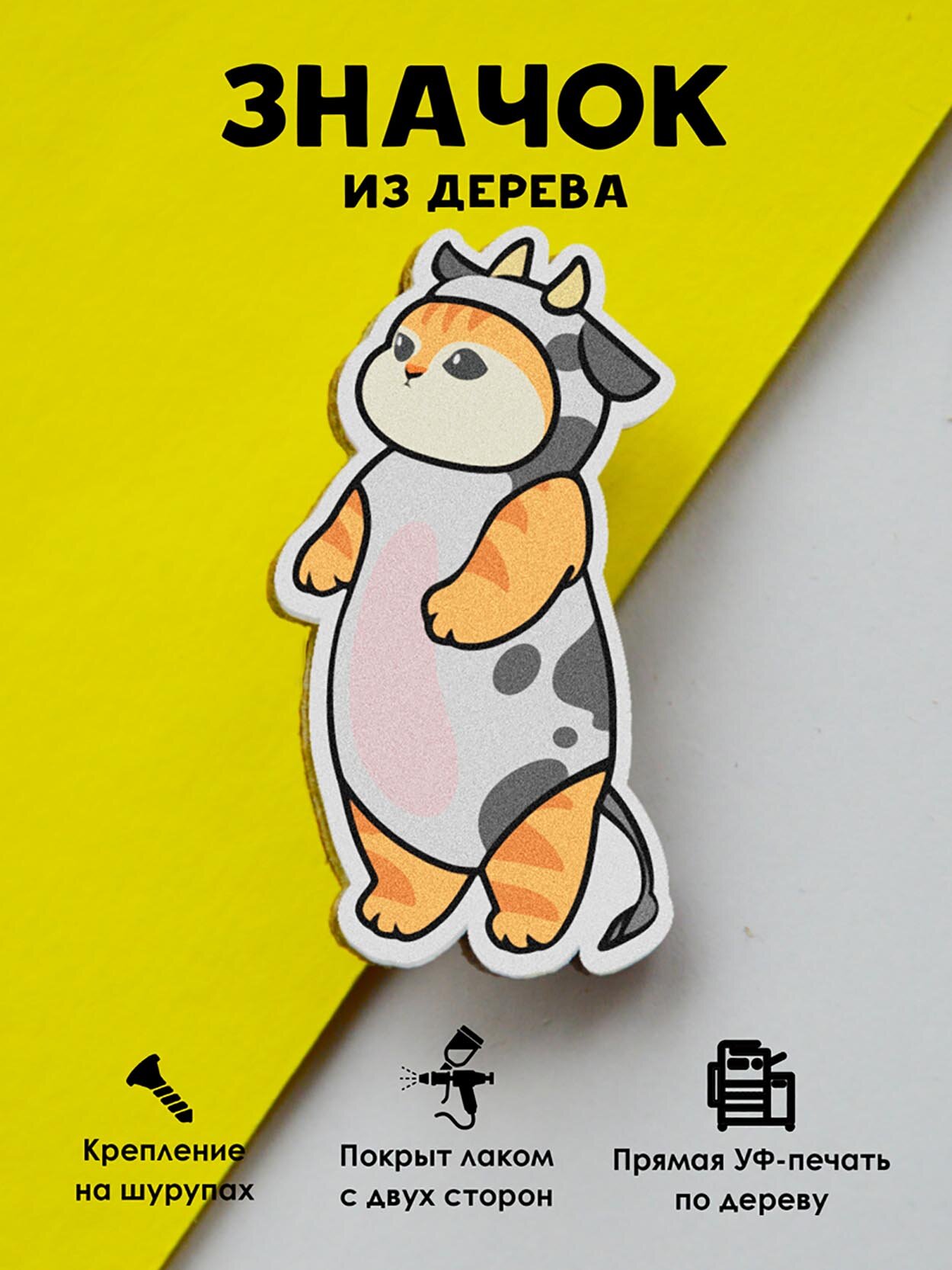 Значок Mr. Znachkoff "Котик-корова", дерево, УФ-печать, влагостойкий лак, ручная сборка, на рюкзак информация: