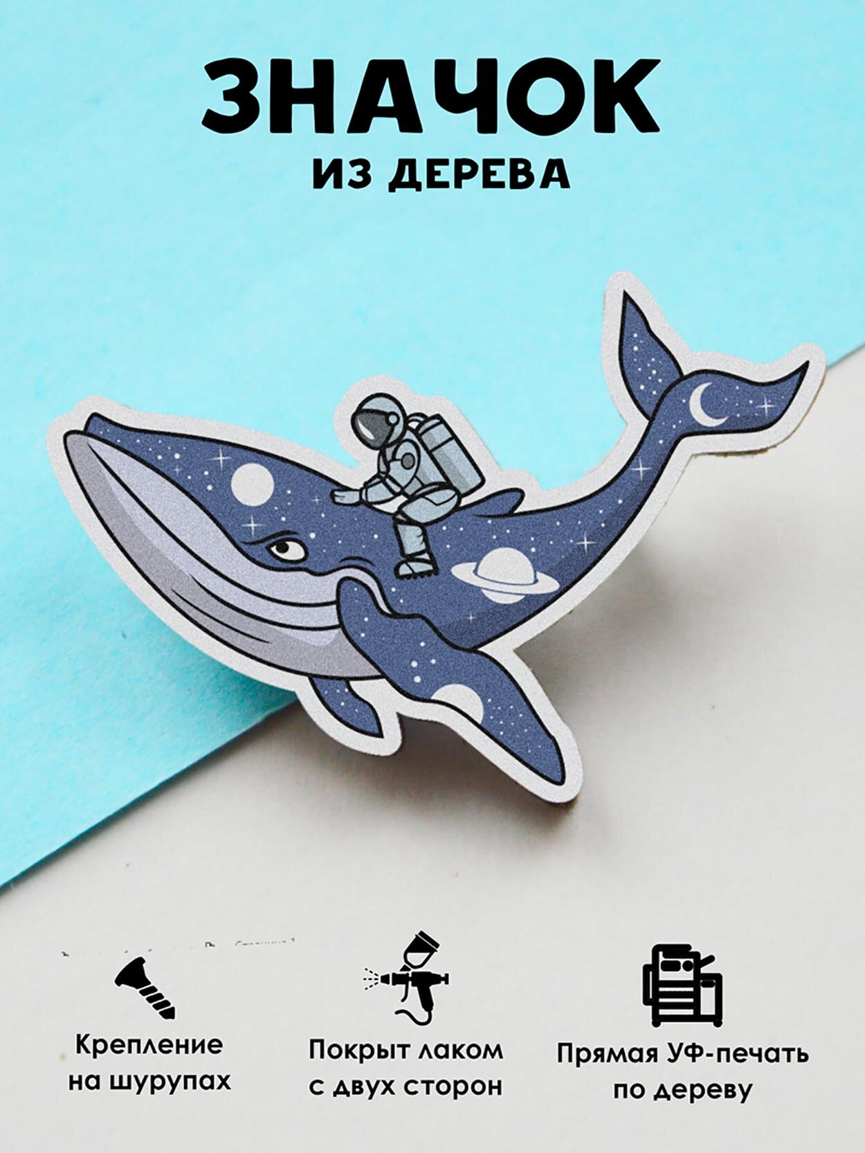 10 цен на Значок Mr. Znachkoff "Космо кит", дерево, ручная сборка, УФ-принт, 4х4 см