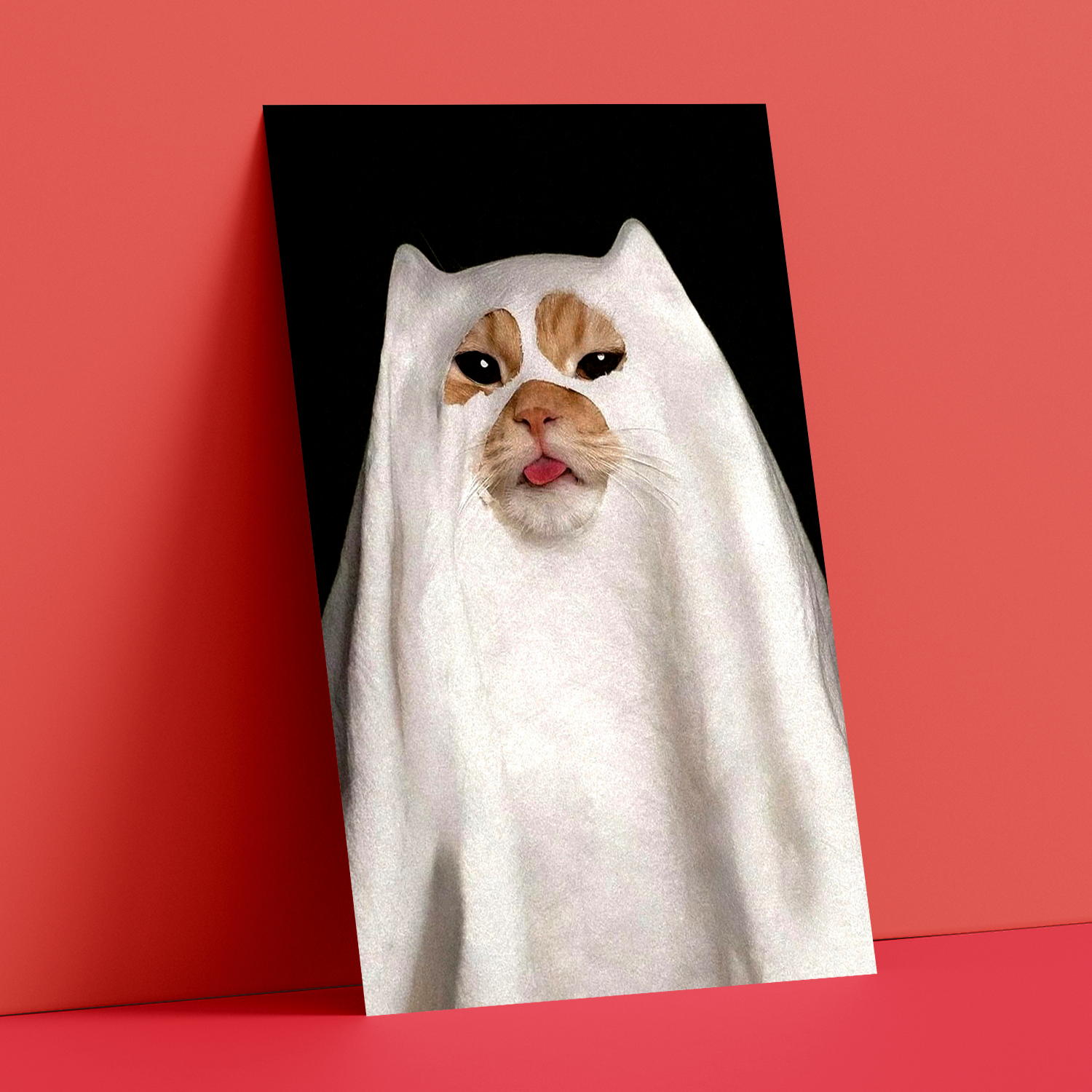 10 цен на Дизайнерская открытка "Котик привидение" (10х15см, плотная бумага, авторский креатив)