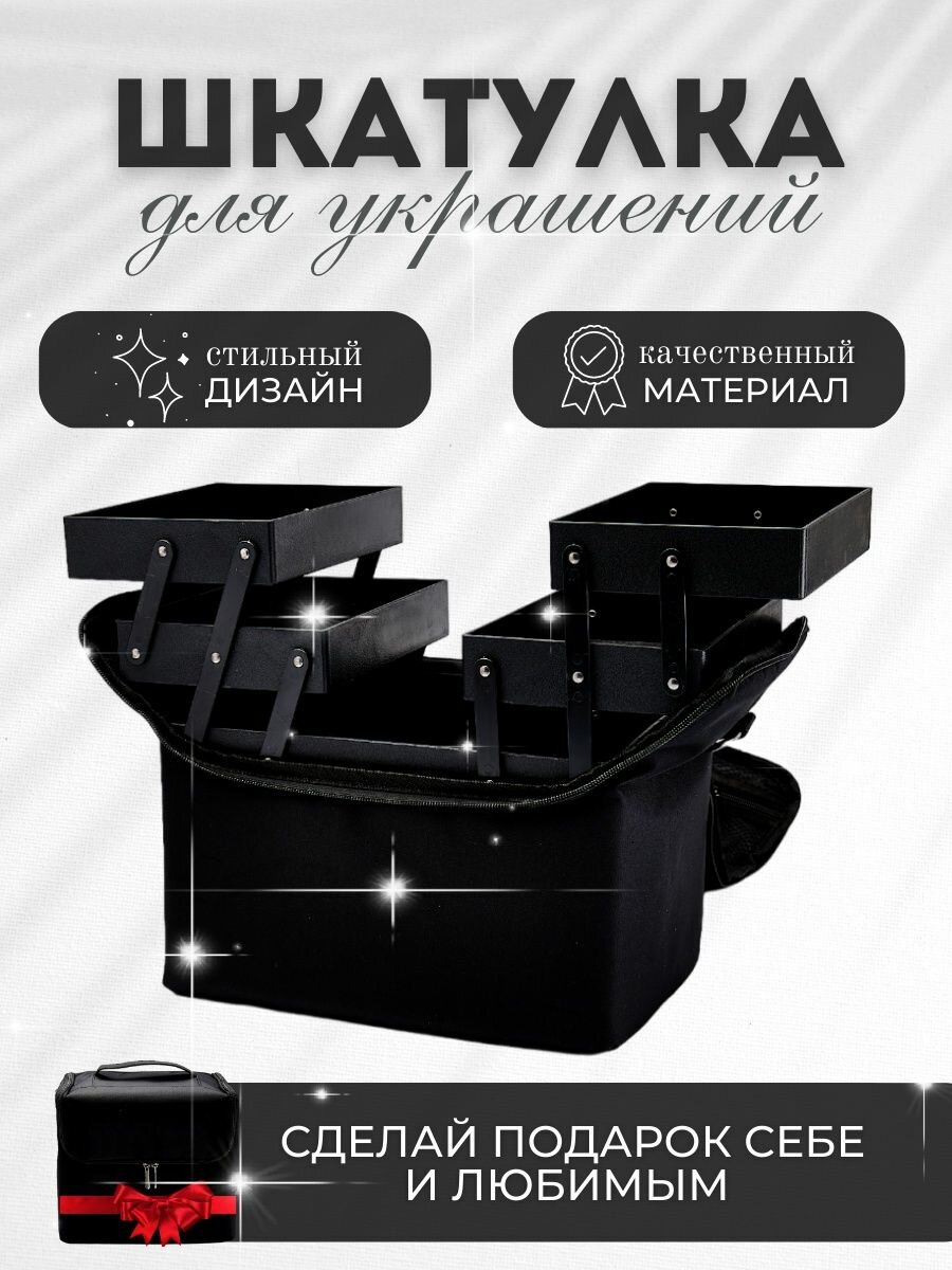 Шкатулка бьюти-кейс большая для украшений, бижутерии, часов, маникюрных инструментов с замком черная информация: