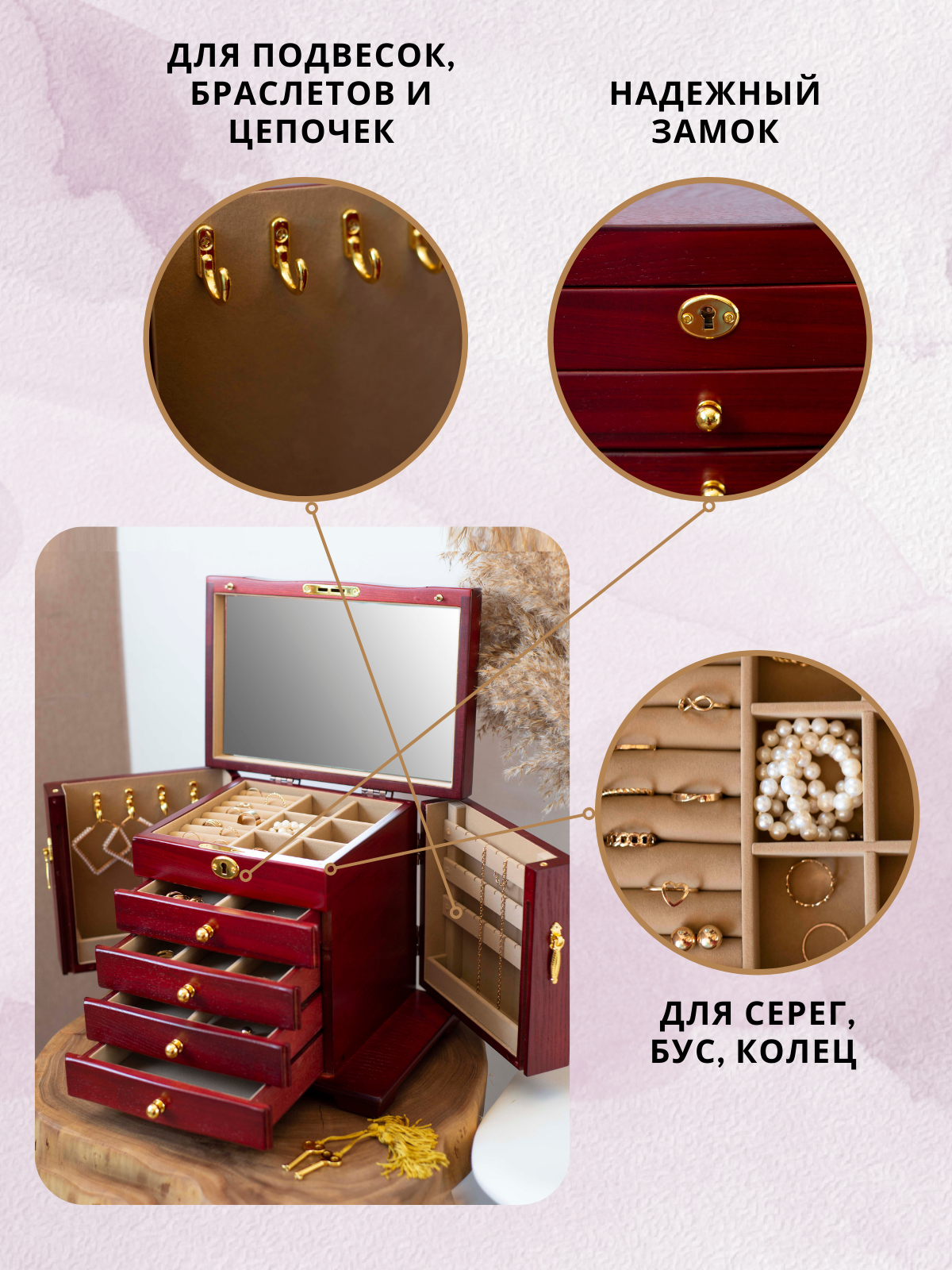 Отзывы на Шкатулка для украшений деревянная с зеркалом и замком, цвет красное дерево