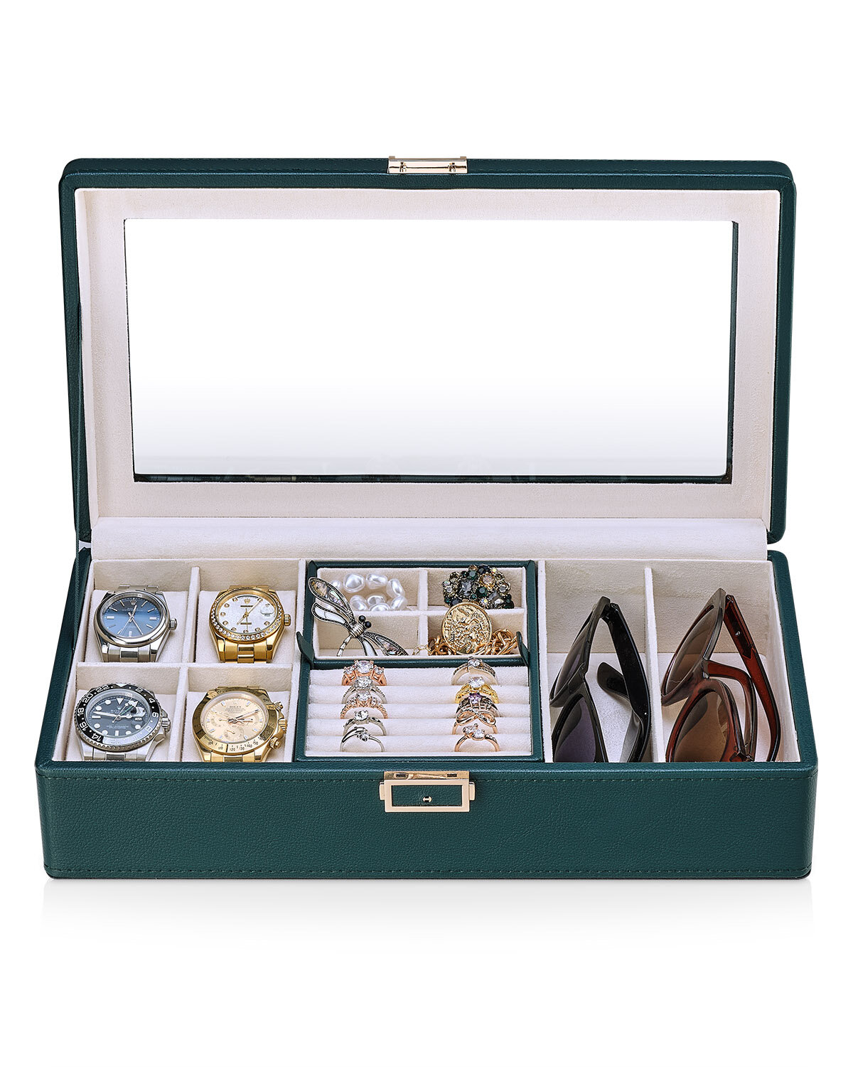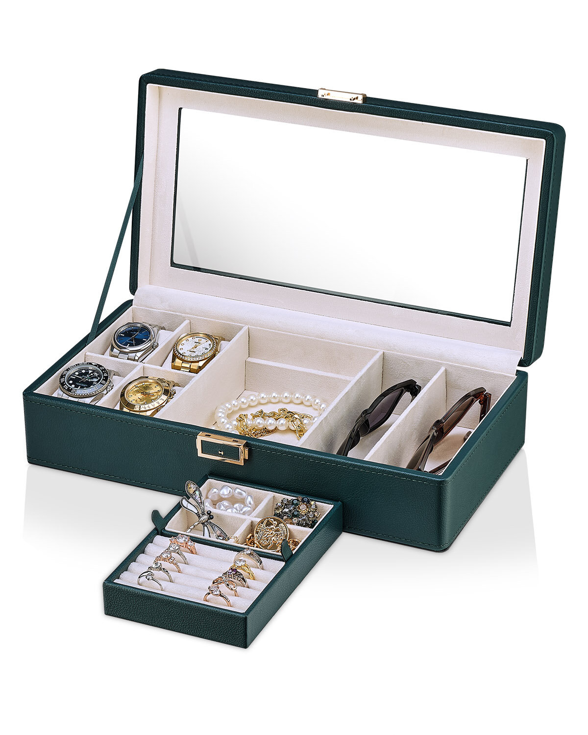 Отзывы на Шкатулка органайзер для хранения наручных часов, ювелирных украшений и очков универсальная Kalahari-4+2-green