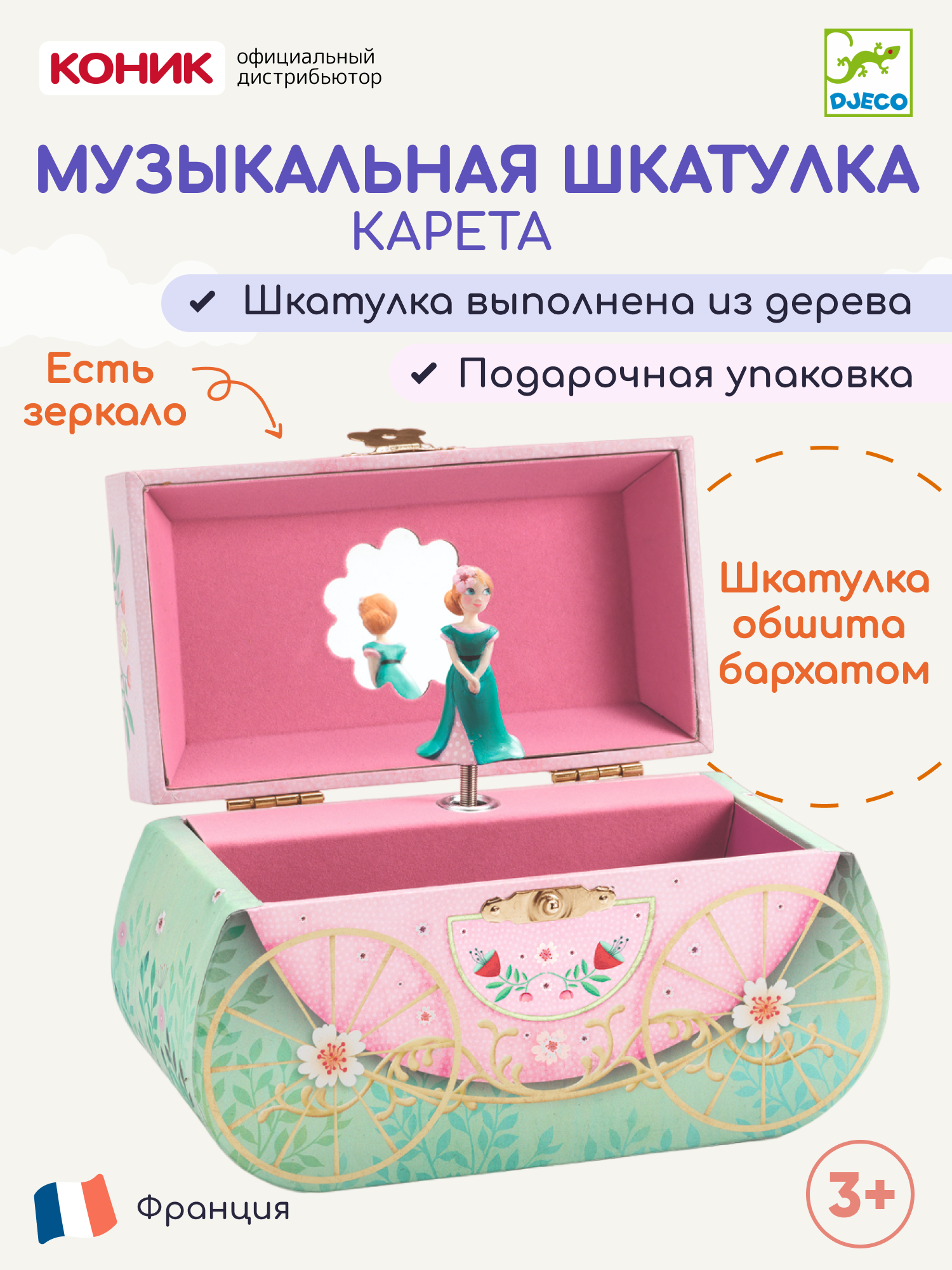 Музыкальная шкатулка "Карета" Djeco , дерево, бархат, замок, зеркальце, для украшений информация: