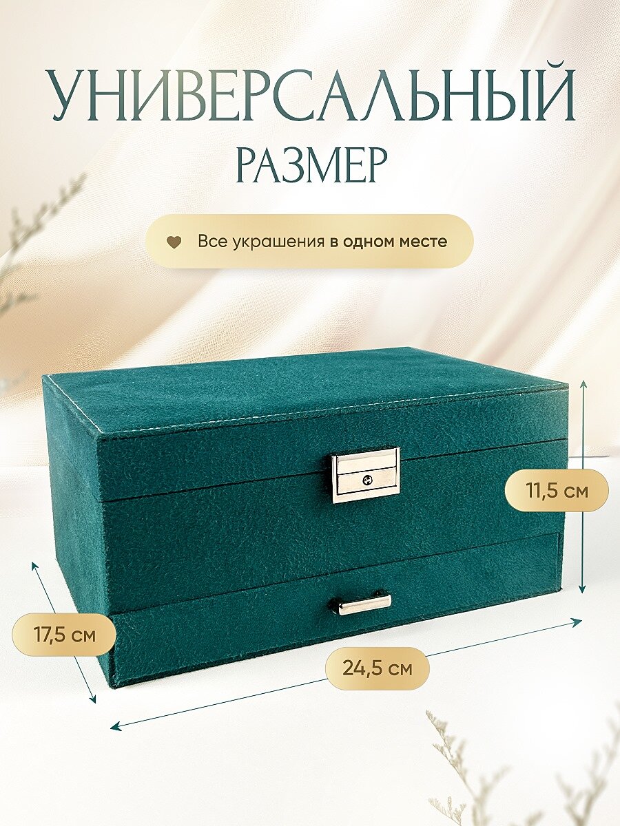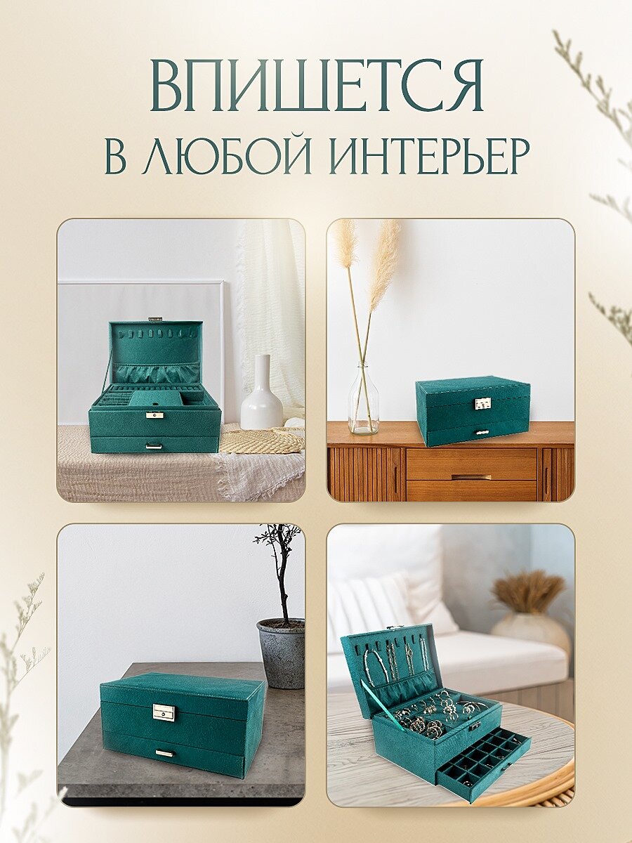 Шкатулка-сундук, 3 отсека, для украшений, бархатный текстиль, изумрудно-зеленая информация: