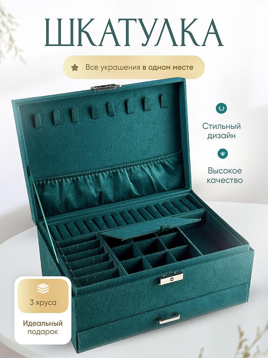 10 цен на Шкатулка-сундук, 3 отсека, для украшений, бархатный текстиль, изумрудно-зеленая