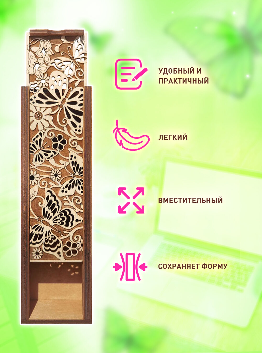 Пенал - шкатулка Woodenking из дерева для хранения канцелярии и бижутерии "Бабочки" информация: