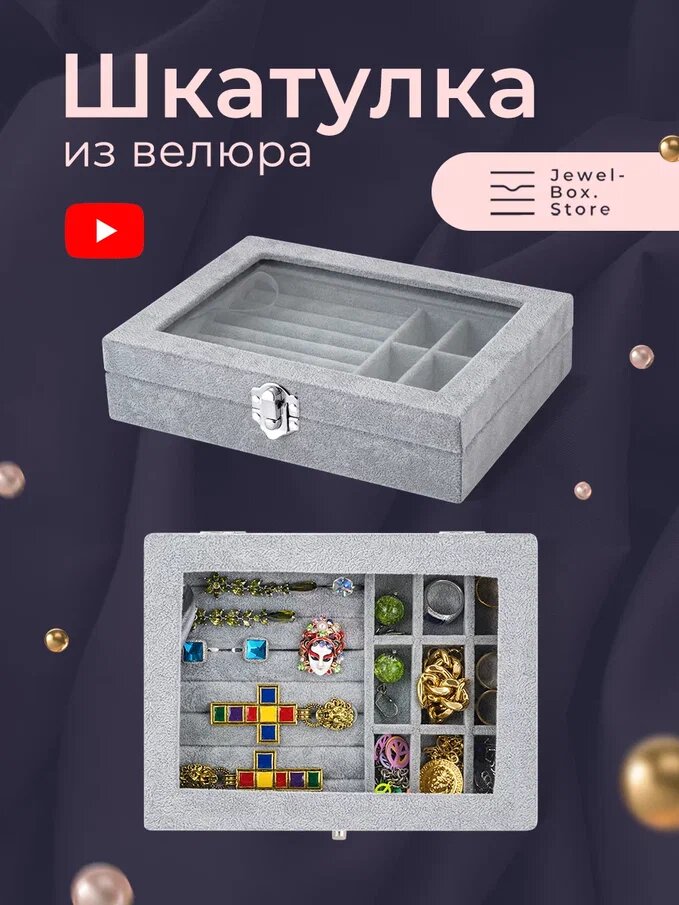 Отзывы на Шкатулка для хранения украшений Римма из велюра Jewel-Box. Store, серая с крышкой из стекла