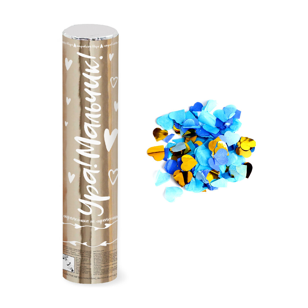 Пневмохлопушка (12/30 см), Гендер Пати, Ура, Мальчик, Сердца фольга и тишью, Голубой/Золото, 1 шт. информация: