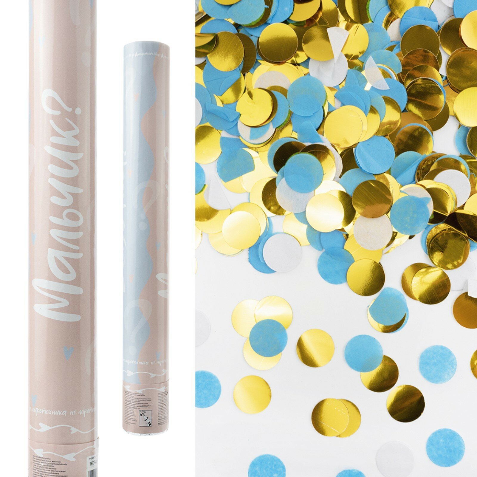 10 цен на Пневмохлопушка (16/40 см), Гендер Пати, Это Мальчик, Круги фольга и тишью, Белый/Голубой/Золото, 1 ш