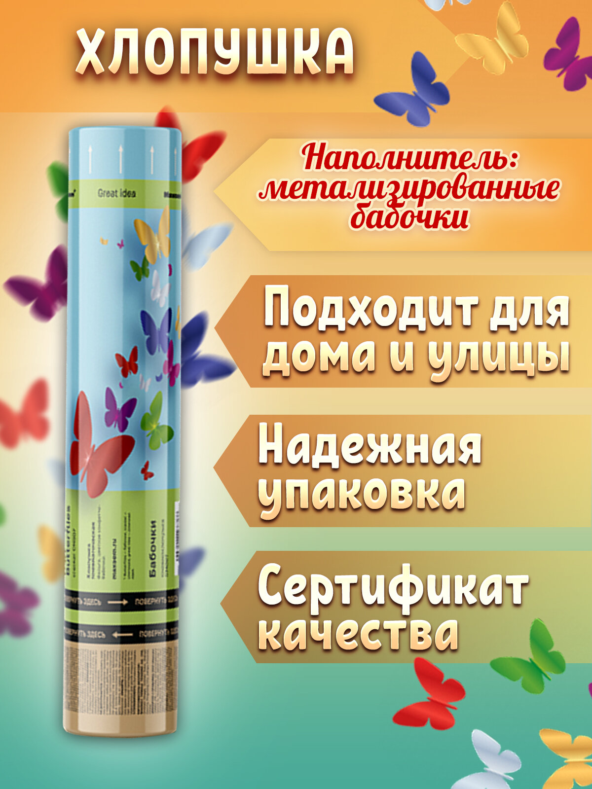 Пневматическая хлопушка на праздник Бабочки разноцветные, Фольга, 30 см 414 ₽