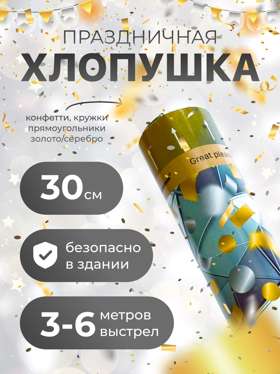 10 цен на Хлопушка пневматическая. Золотое и серебряное конфетти. Прямоугольники и кружки. 30см
