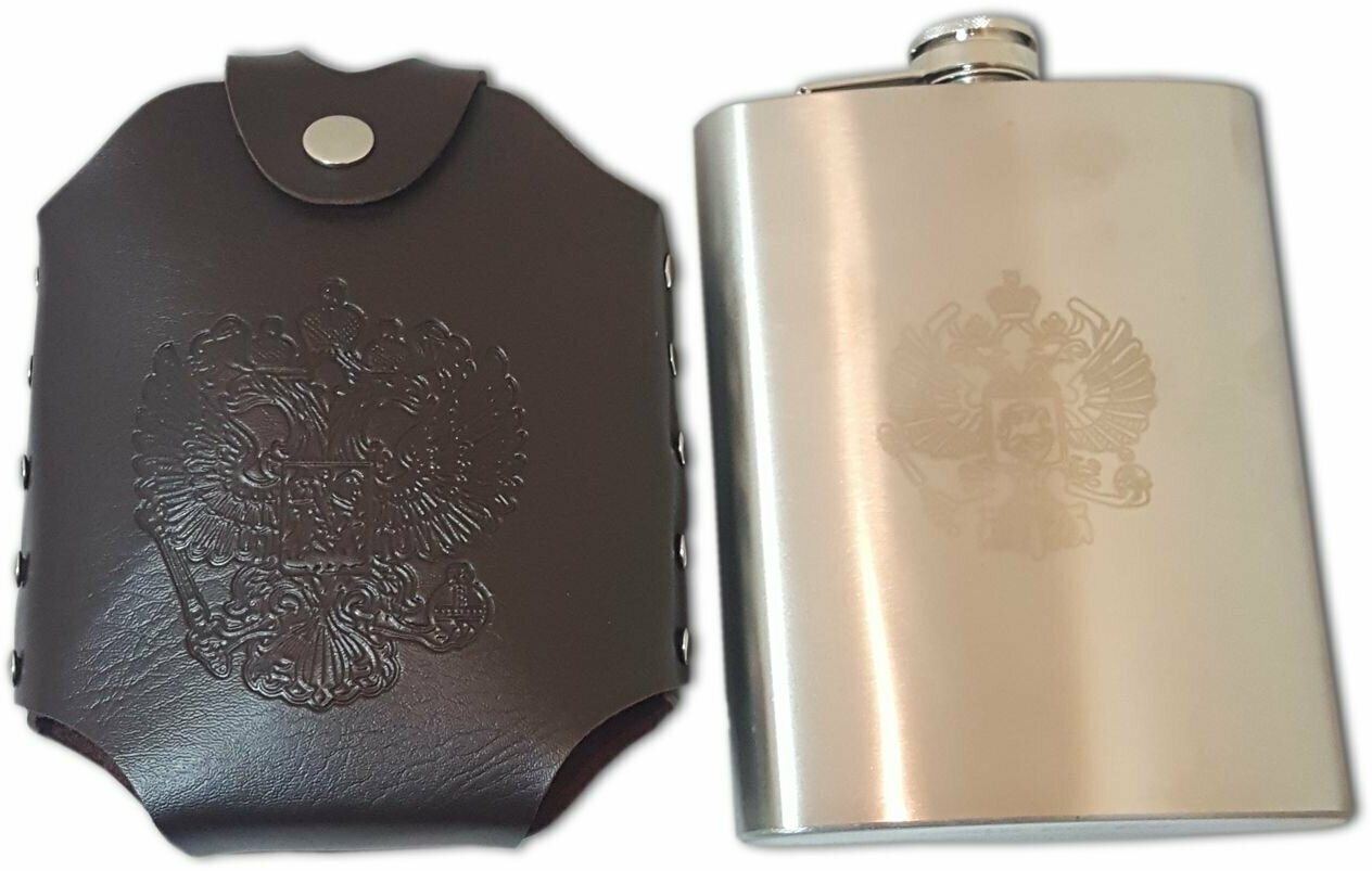 Фляга в кожаном чехле с ремешком на плечо, тиснение Герб России, 340 мл. информация: