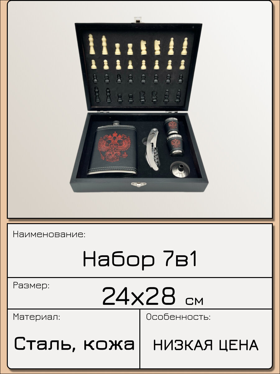 10 цен на Подарочный набор 7 в 1: фляжка, 2 рюмки, воронка, шахматы, штопор 24х28 см.