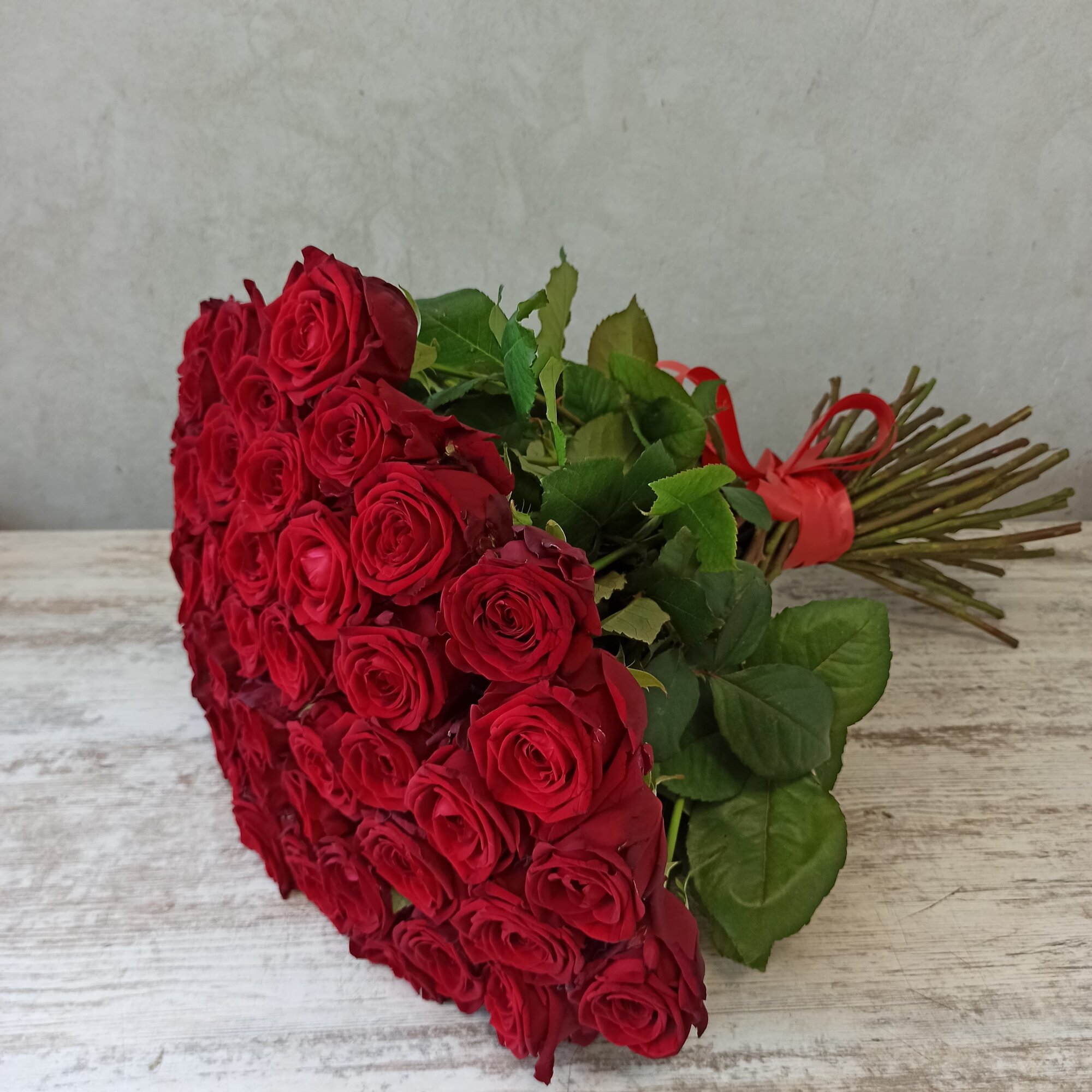 10 цен на Живые цветы букет из 51 красной розы 60 см "Огненный поцелуй", сорт - "Ред Наоми"
