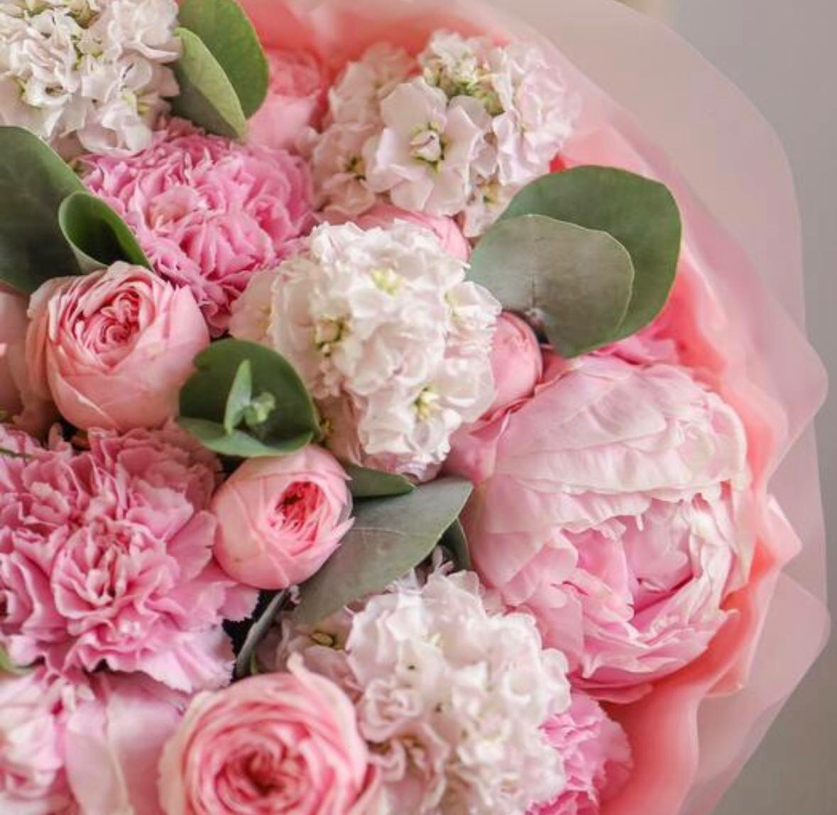 10 цен на Авторский букет (пионы Сара Бернар, маттиола, пионовидные розы, гвоздики)