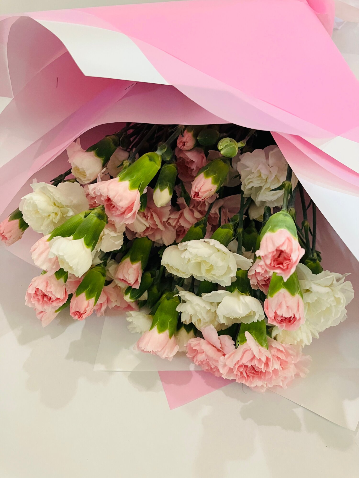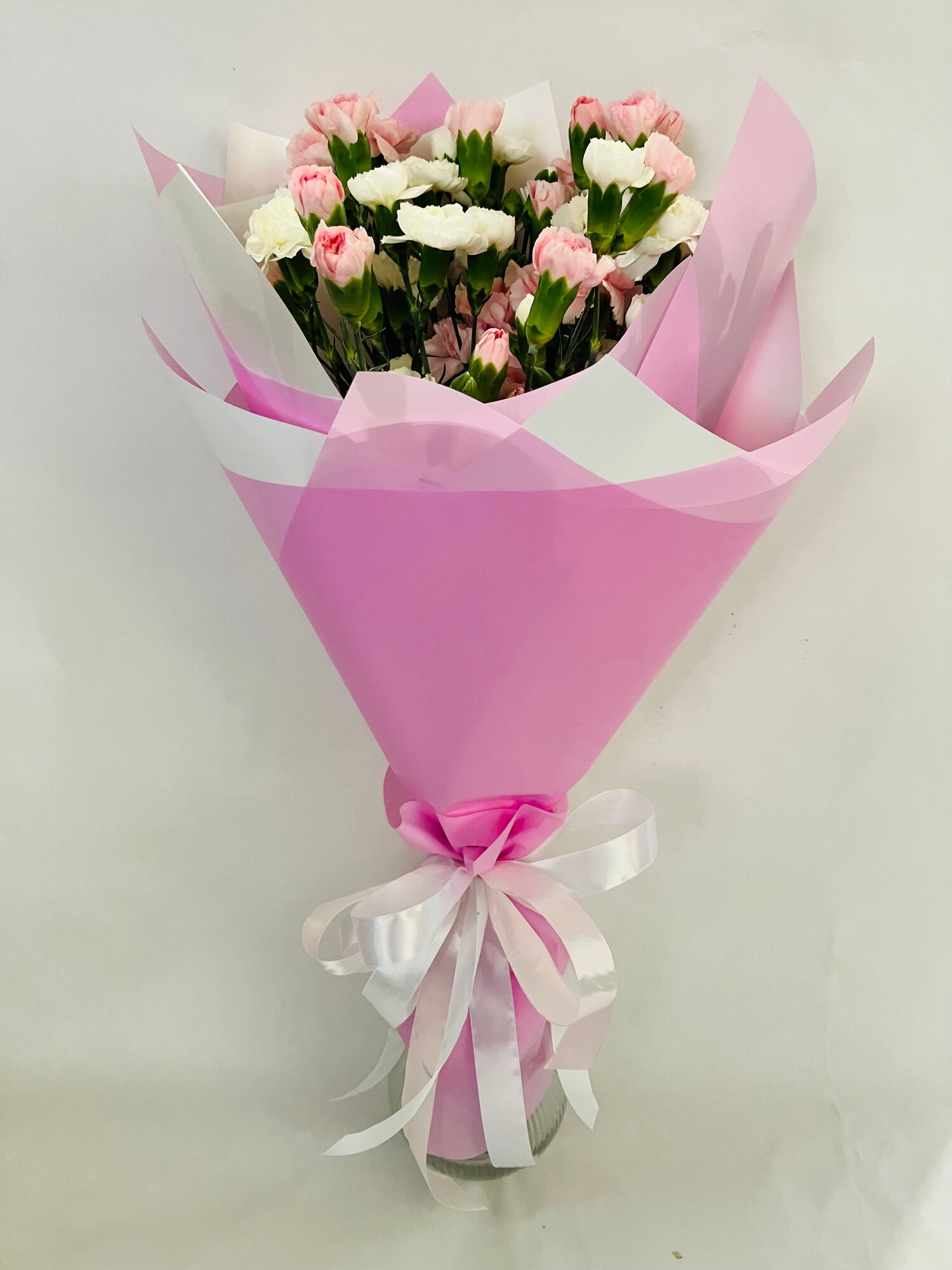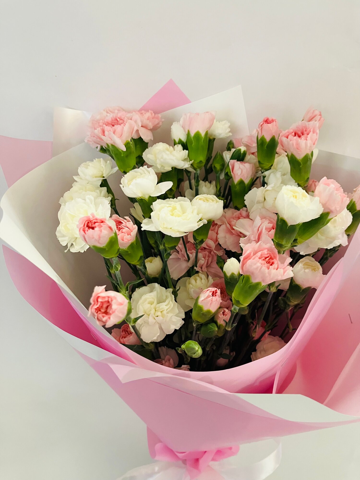 10 цен на Букет из 15 свежих, белых и розовых кустовых гвоздик микс, 55 см+, в дизайнерской упаковке, атласный бант.