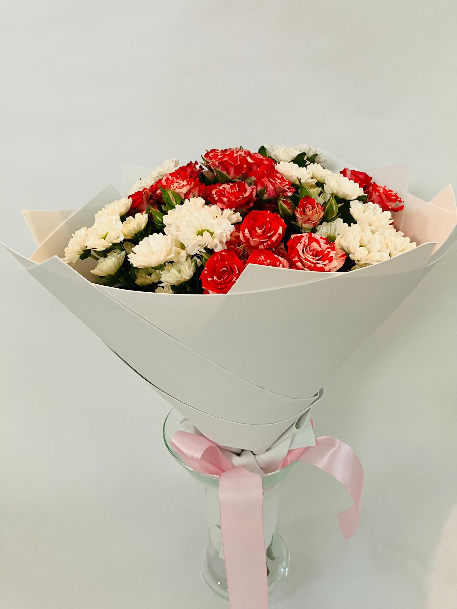 10 цен на Букет из кустовых роз Фейерверк и белой хризантемы сантини, в белой , дизайнерской упаковке, атласный бант.
