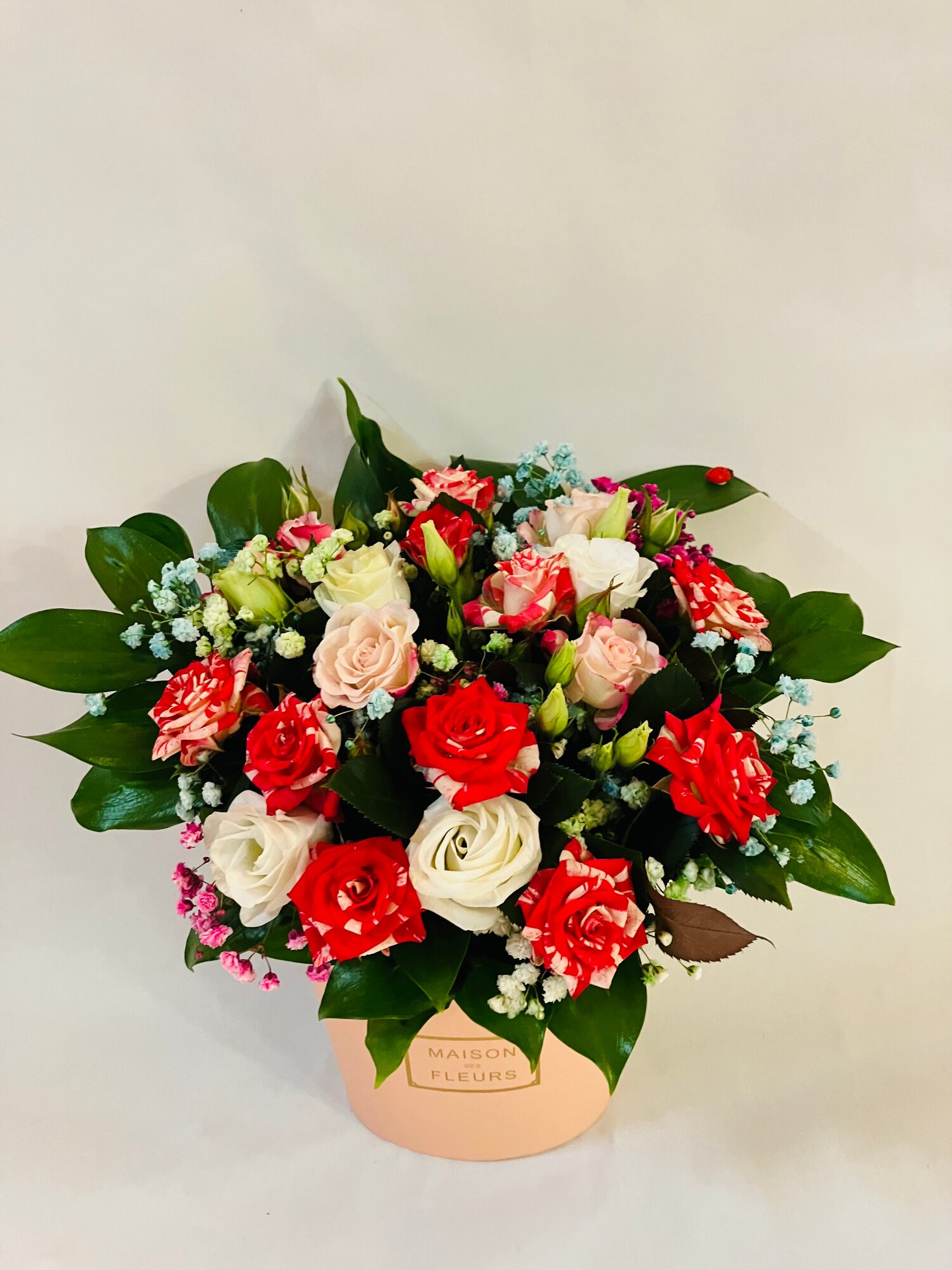 10 цен на Букет композиция с кустовой розой Фейерверк в коробке Мейсон-крем