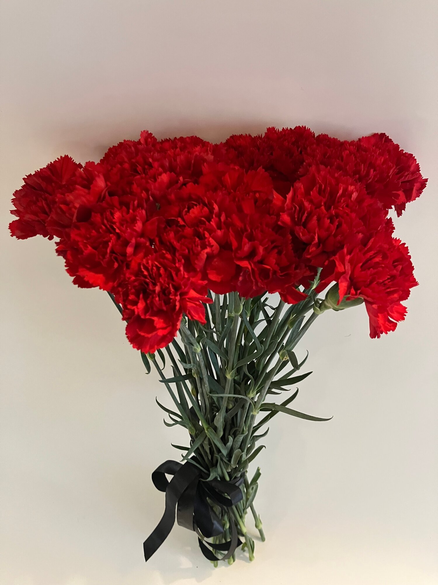 10 цен на Букет красных гвоздик, 25 штук, 55 см+, под чёрный , атласный бант.