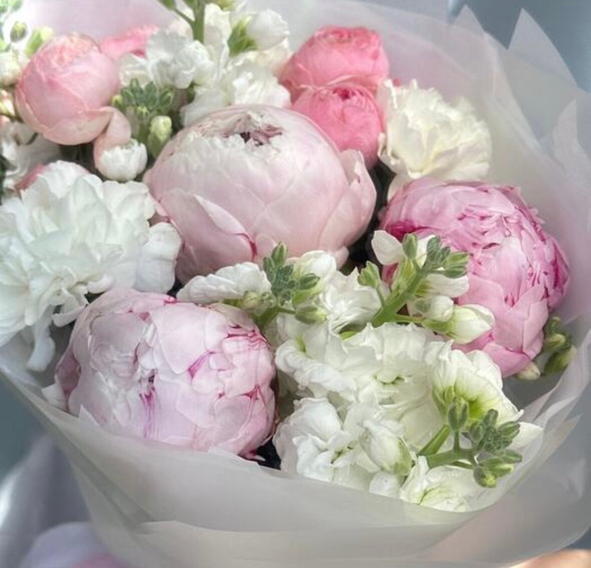 10 цен на Букет «Цветочная сладость» (пионы Сара Бернар, пионовидные розы Менсфилд Парк Пинк, диантусы, маттиола)